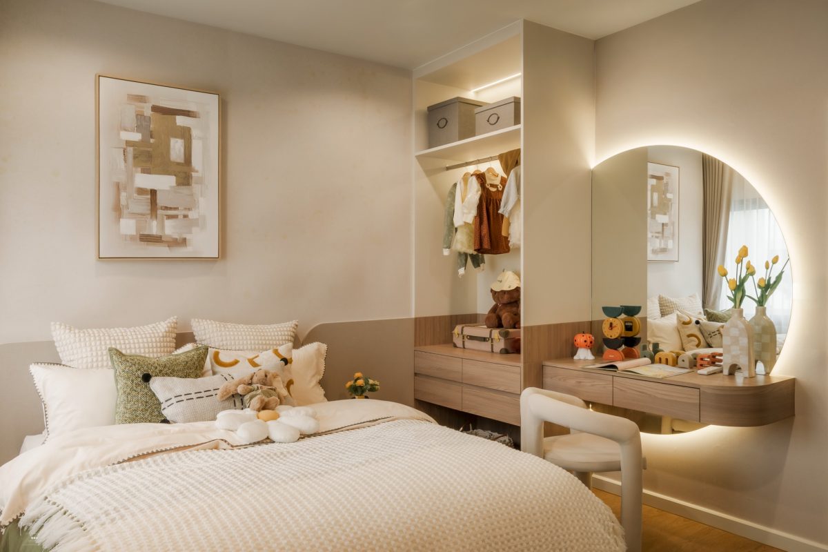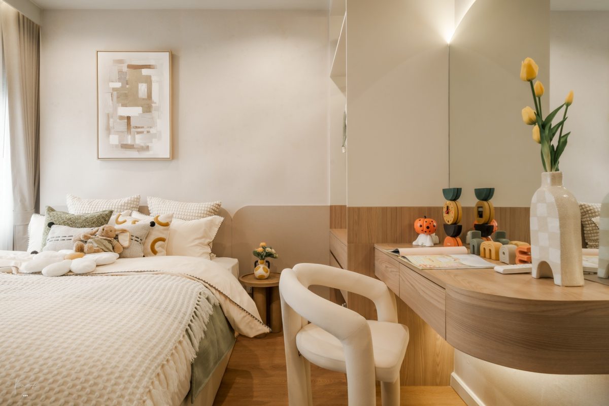 ด้านข้างเตียงจัดวางโต๊ะอเนกประสงค์สำหรับเป็นมุมนั่งทำการบ้าน อ่านหนังสือ และมีตู้เสื้อผ้าจัดวางเอาไว้ด้านข้างเช่นกัน ฝ้าเพดานประดับด้วยไฟส่องสว่าง ห้องนี้มีห้องน้ำในตัวเช่นกัน กานต์มองว่าดีเทลนี้สำคัญมากนะครับ เพราะถ้าเราเป็นครอบครัวที่มีลูก นี่จะเป็นการมอบพื้นที่ส่วนตัวให้เขาได้เติบโตและรับผิดชอบพื้นที่ของตัวเอง
