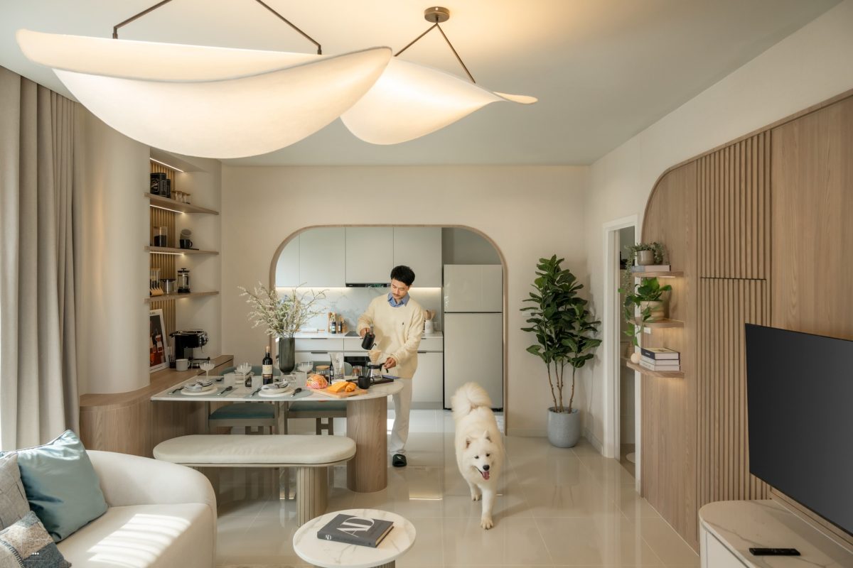 เมื่อเปิดประตูเข้ามา เราจะสัมผัสได้ถึงการวางเลย์เอาต์แบบ Open Plan ที่เปิดพื้นที่ให้ห้องนั่งเล่นและมุมรับประทานอาหารเชื่อมต่อกันอย่างอิสระ
