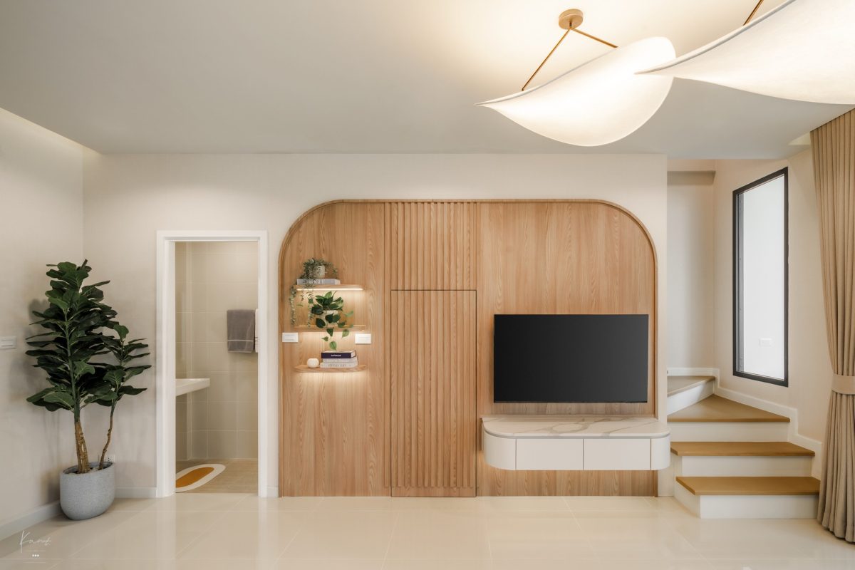 ผนังไม้ Slat สีน้ำตาลอ่อนอบอุ่น ฝ้าเพดานสีครีม พื้นกระเบื้องสีอ่อนบนชั้น 1 และพื้นปาร์เก้ไม้บนชั้น 2-3 โทนสีโดยรวมอยู่ในกลุ่ม Warm Neutral ที่ดูไม่เคยเบื่อ นี่คือการตัดสินใจออกแบบที่ฉลาดมากสำหรับบ้านที่ผู้อยู่อาศัยจะอยู่ด้วยอีกหลายปี