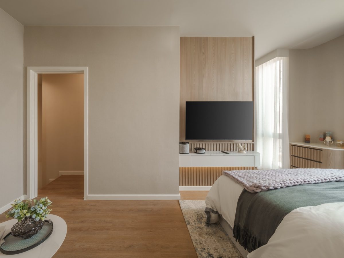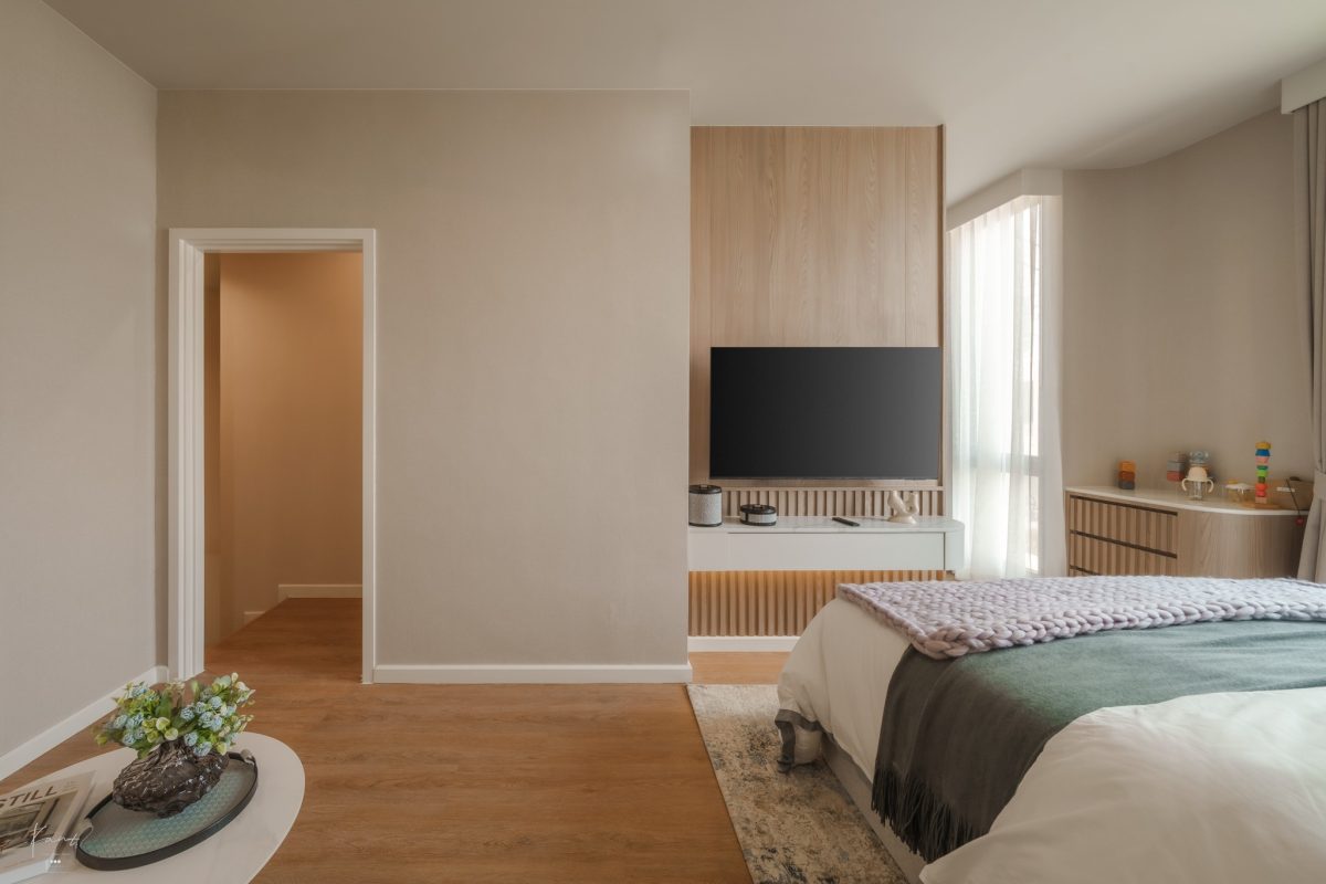 ปลายเตียงจัดชั้นวางทีวีขนาดไปกับความยาวของห้อง