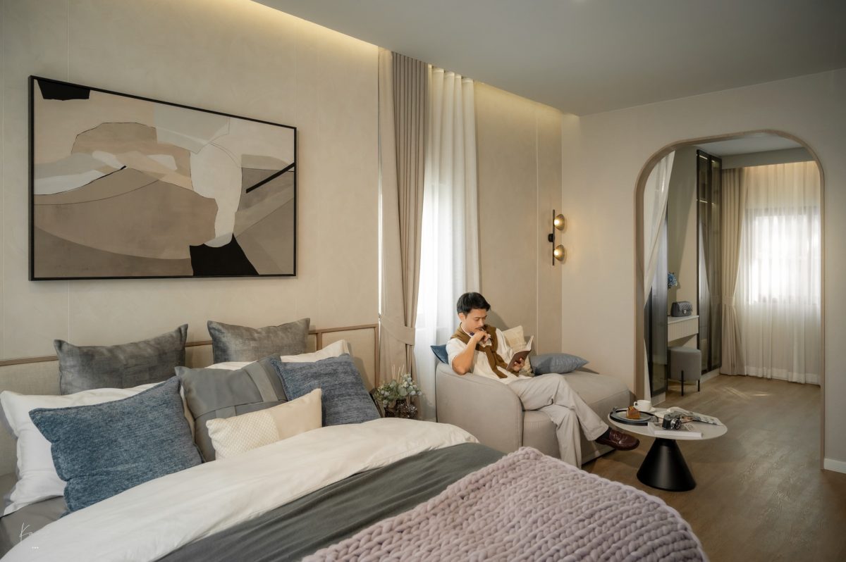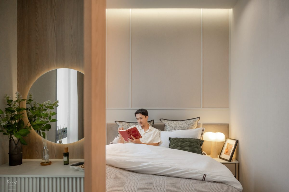 ถัดเข้ามาด้านในเป็นโซนพักผ่อน เตียงนอนจัดวางไว้พร้อมโต๊ะหัวเตียง ผนังมีหน้าต่างกระจกบานใหญ่เปิดรับแสงธรรมชาติ ทำให้ห้องดูโปร่งอยู่สบายไม่รู้สึกคับแคบ