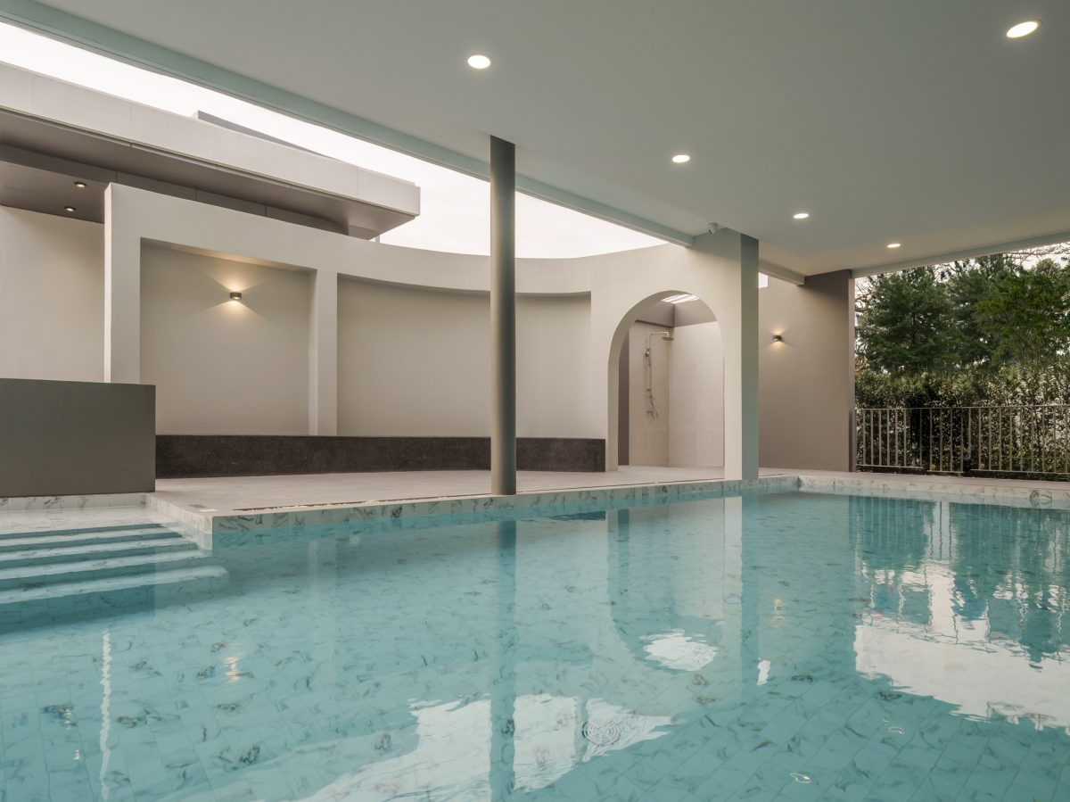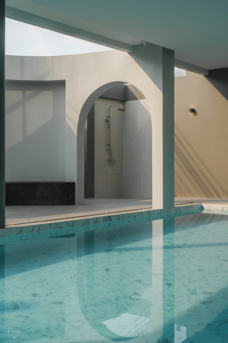 สระว่ายน้ำอยู่ชั้นล่างเป็นสระแบบ Semi-outdoor เป็นสระระบบเกลือ ขนาด 12.60×4.00 เมตร ลึก 1.20 เมตร มีแยกสระว่ายน้ำสำหรับเด็กด้วยครับ งานดีไซน์ใช้ Arch โค้งที่ Echo กับภาษาการออกแบบของตัวอาคาร มีจุดให้ล้างตัวก่อนลงสระ มองเห็นแสงธรรมชาติที่ลอดลงมาจากด้านบนทำให้น้ำในสระดูสีฟ้าใส ให้ความรู้สึกใกล้เคียงกับสระว่ายน้ำในโรงแรมบูทีคมากกว่า Clubhouse ทั่วไปที่มักเป็นสระสี่เหลี่ยมผืนผ้าธรรมดา