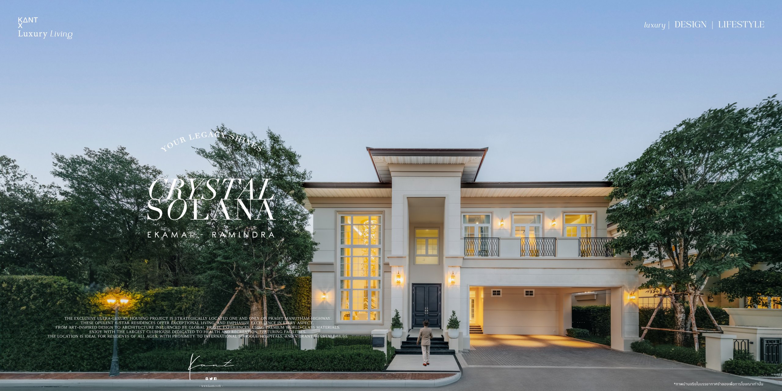 โครงการ CRYSTAL SOLANA เป็นคฤหาสน์หรูระดับ Ultra Luxury Residences นำเสนอสถาปัตยกรรมร่วมสมัยไร้กาลเวลาในแบบ Contemporary Timeless เข้ากับบรรยากาศของการพักอาศัยที่ร่มรื่นด้วยพื้นที่สีเขียวและต้นไม้น้อยใหญ่ตั้งแต่บริเวณด้านหน้าทางเข้าโครงการมาจนถึงสวนส่วนกลางและ Clubhouse ขนาดใหญ่รวมเนื้อที่กว่า 2 ไร่ ภายในโครงการมีทัศนียภาพที่สวยงามเนื่องจากเอาสายไฟลงดินทั้งหมด มาพร้อมกับระบบรักษาความปลอดภัยที่ยอดเยี่ยม ตั้งอยู่ติดกับถนนใหญ่ในทำเลที่ได้ชื่อว่า มีโครงการบ้านหรูรวมกันมากที่สุดคือถนนประดิษฐ์มนูธรรม หรือที่เราเรียกกันง่ายๆ ว่า เลียบทางด่วนเอกมัย-รามอินทรา