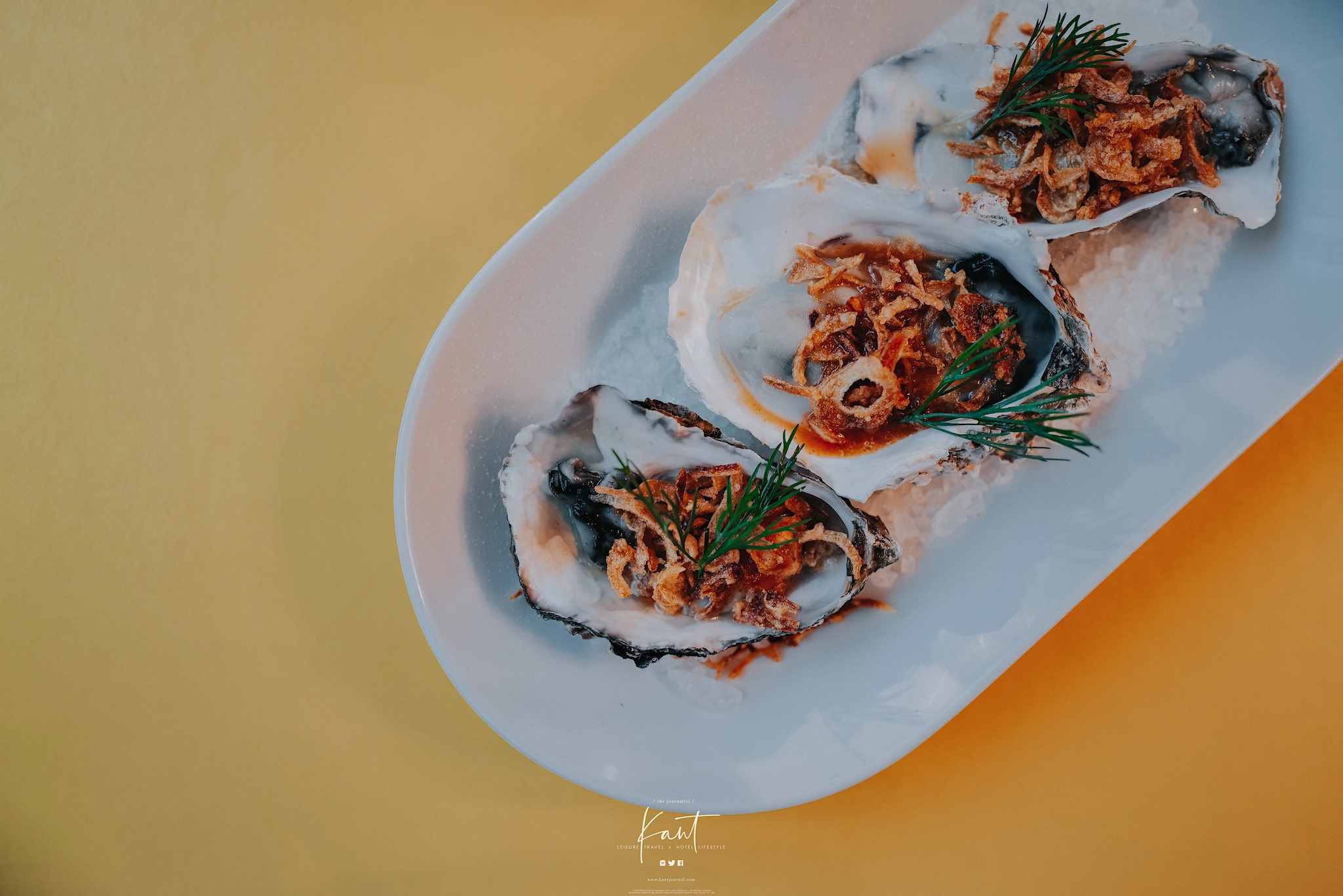 Thai Style Oyster Shooter หอยนางรม เสิร์ฟพร้อมน้ำจิ้มซีฟู๊ด น้ำพริกเผาและหอมเจียว เสิร์ฟมาที่ละ 3 ตัว แต่สั่งได้เรื่อยๆ ครับ