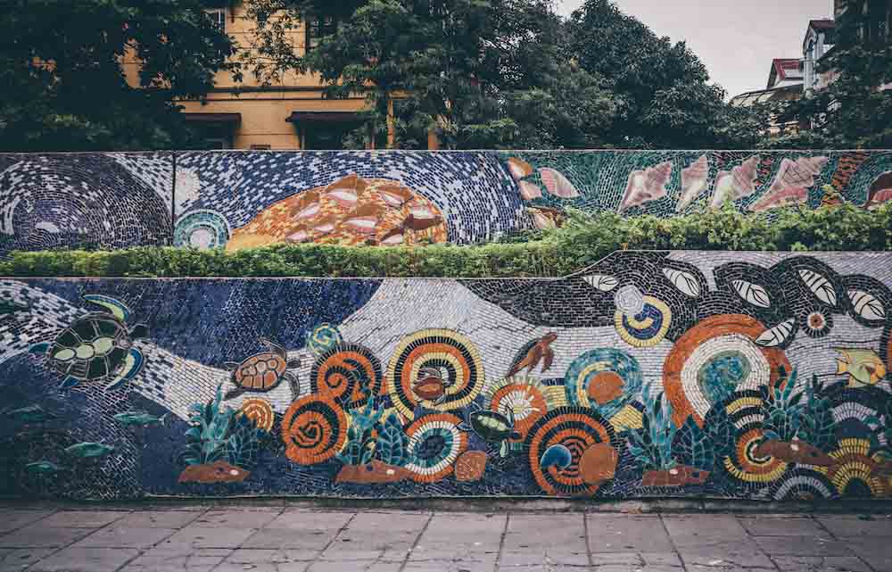 ที่นี่การเดินทางโดย Grab น่าจะเป็นเรื่องที่สะดวกและราคาสมเหตุสมผลที่สุด และสบายที่สุด ระหว่างที่นั่งรถเราก็ชมวิวสองข้างทางกันไป ผ่านจุดแรกที่น่าสนใจคือกำแพงโมเสค เป็นงานศิลปะริมทางที่คอยบอกเล่าเรื่องราวต่างๆ ของ ฮานอยและเวียดนาม ราวกับเป็นการฉายภาพวีดีโอต้อนรับแขกต่างถิ่น ก่อนจะเข้าสู่ตัวเมืองฮานอย