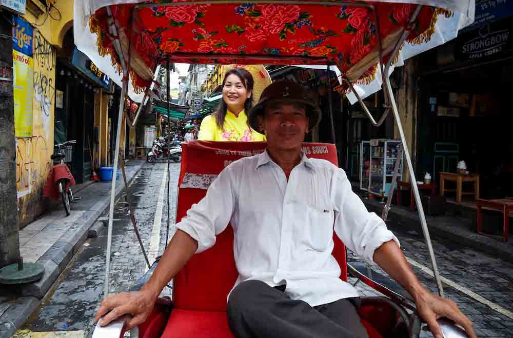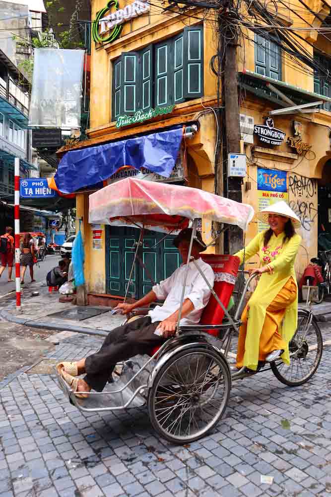 ได้ชุดอ๋าวหญ่ายมาแล้ว หาที่เปลี่ยนชุดแล้วไปถ่ายรูป หาอะไรทำสนุกๆ กันดีกว่า เราแต่งชุดอ๋าวหญ่ายสีเหลืองปั่นรถสามล้อญวน หรือ “รถซิโคล่” ครับ ซึ่งเราก็ได้มีการสลับบทบาทกัน ให้ชายชาวเวียดนามซึ่งมีอาชีพปั่นสามล้ออยู่แล้วมาลองเป็นผู้โดยสารสบายๆ เราจะปั่นพาไปเยี่ยมชมเมืองเก่า ก็ถือว่าเป็นแลกเปลี่ยนทางวัฒนธรรมซึ่งกันและกันครับ ซึ่งการจากขับรถซิโคล่ หรือว่าสามล้อถีบในเมืองฮานอยนั้นไม่ใช่เรื่องง่าย เพราะว่าต้องขับฝ่ากองทัพรถมอเตอร์ไซต์ที่มีไม่ต่ำกว่า 5 ล้านคัน บีบแตรกันสนั่นลั่นถนน รวมไปถึงคนเดินเท้าที่พลุกพล่านพอสมควรและต้องคอยระวังรถยนต์ด้วยครับ