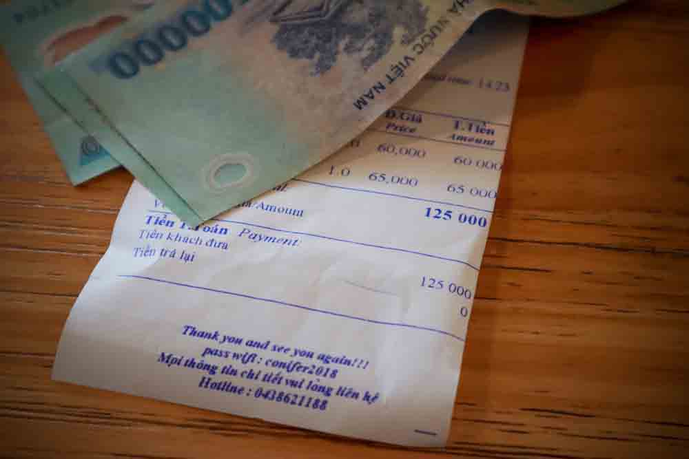 ที่เวียดนาม กินกาแฟทีจ่ายกันเป็นแสน (ด่อง-สกุลเงินหลักของเวียดนาม) เพราะค่าเงินอ่อน เราเลยตกอยู่ในภาวะ “รวยเฉียบพลัน” พกเงินกันทีเป็นล้านๆ แนะนำว่ามาหาที่แลกเงินกันในเมืองจะได้เรตที่ดีกว่า ที่สนามบินก็มีร้านแลกเงิน ร้านขายซิมอยู่ในร้านเดียวกัน ควรแลกพอแค่จ่ายค่าซิมและค่า Grab Car เข้าเมืองก็พอ