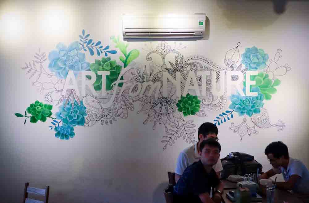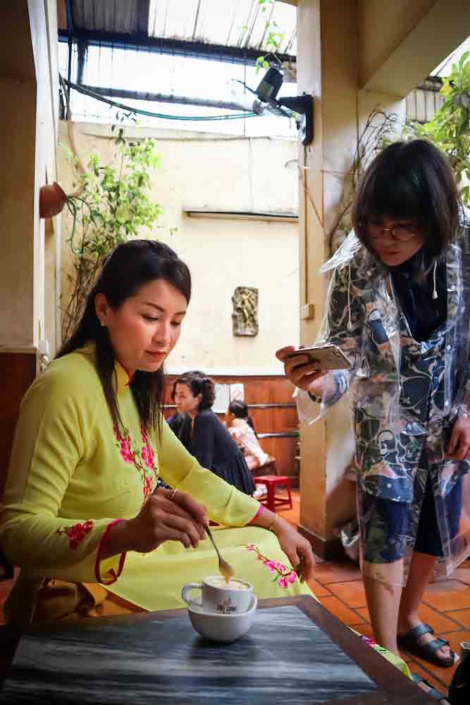 เมื่อพกเงินตุงกระเป๋า เราได้มีโอกาสไปแวะจิบกาแฟหลายร้าน เอกลักษณ์ที่เหมือนกันของกาแฟเวียดนามคือ หวาน-ขม (เหมือนชีวิตเราตอนนี้เลย) บางเมนูก็รู้สึกว่า จะหวานไปไหน จิบๆ ไป อ้าว ขม ถ้าจะสั่งแนะนำให้ถามว่ามีนมสด ไหม จะดีต่อใจมากกว่าใส่นมข้นหวานนะ ร้านกาแฟบางร้านต้องใช้การ “ตามล่า” มากกว่าปกติ เพราะร้านจะอยู่เป็นซอกทางเข้า (เล็กๆ) ต้องสังเกตป้าย (ซึ่งก็เล็กๆ) ให้ดี เช่น ร้าน NOLA CAFE เป็นร้านที่ชิลล์มาก ตกแต่งสไตล์โบราณ ทึมๆ และมีมุมริมหน้าต่าง ให้นั่งสังเกตความเป็นไปของผู้คนบนถนน