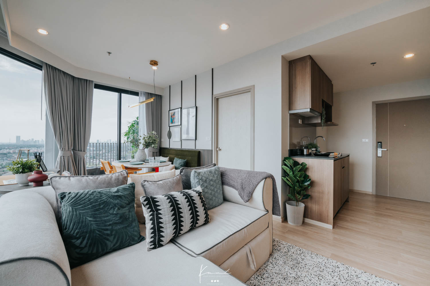 ภายในจะโดดเด่นด้วยกระจกบานใหญ่ที่ให้เราเปิดรับแสงและวิวจากภายนอกได้เต็มที่ มีมุมนั่งเล่นที่เชื่อมต่อกับส่วนรับประทานอาหารขนาด 2 ที่นั่งและเคาน์เตอร์ครัวซึ่งทางโครงการได้ติดตั้งตู้เก็บของชั้นบน-ล่าง, เตาไฟฟ้าพร้อมเครื่องดูดควัน ซิงค์ล้างจาน และยังได้เปิดช่องสำหรับจัดวางไมโครเวฟ เครื่องซักผ้าและตู้เย็นเอาไว้ให้เรียบร้อย