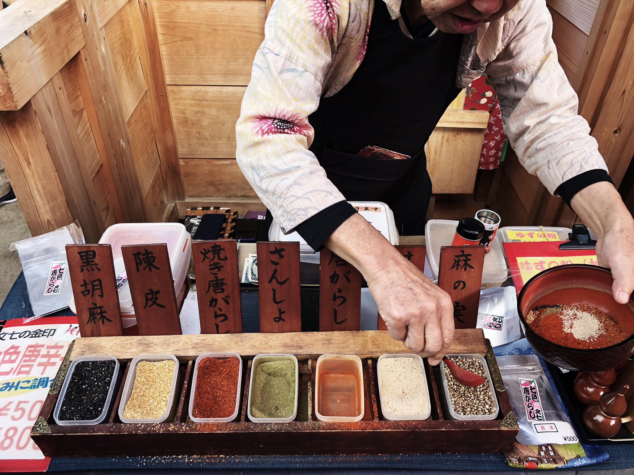 ลุงซาโอะ (นามสมมุติ) ตั้งใจผสมพริกและเครื่องเทศที่เรียงรายหลากหลายสายพันธุ์ตามแต่ที่ลูกค้าต้องการ