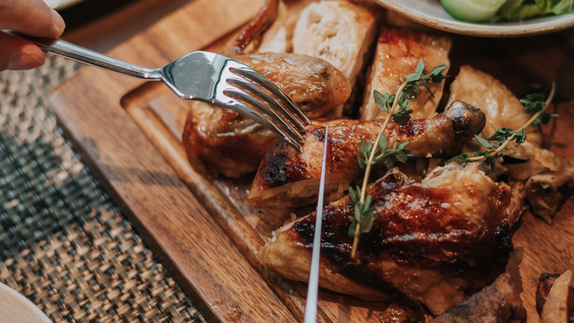 ผมสั่ง Italian Style Whole Roasted Organic Chicken เป็นไก่ออร์แกนิคอบสไตล์อิตาเลี่ยน เชฟอันเดรีย เล่าว่า จะใช้ไก่จากฟาร์มที่เขาใหญ่ นำมายัดไส้ด้วยสมุนไพรและผักประจำฤดูกาล หมักข้ามคืนด้วยเครื่องเทศสไตล์อิตาเลี่ยนให้เข้าเนื้อ จากนั้นจะนำเข้าไปอบในเครื่อง Rotisol ซึ่งจะค่อยๆ หมุนไก่ไปเรื่อยๆ ทั้งตัว ประมาณชั่วโมงครึ่ง
