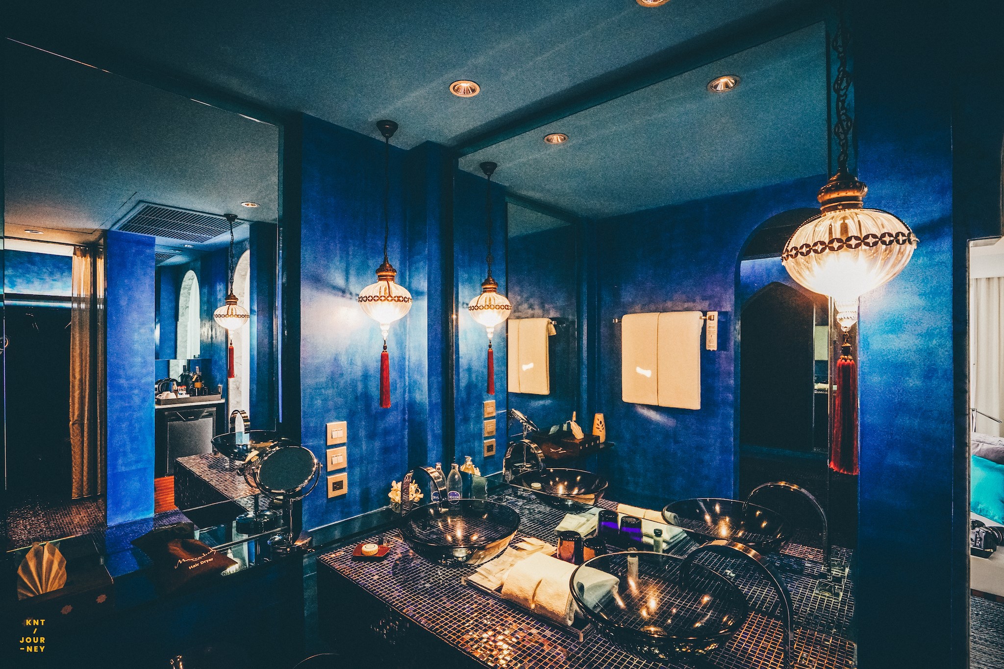 ห้องสุขา มีความเรียบง่าย แต่ยังคงเอกลักษณ์สไตล์โมร็อกโก คือเพิ่มดีเทลเล็กๆ น้อยๆ อย่างโคมไฟ หรือตัวชักโครกแบบลอยได้