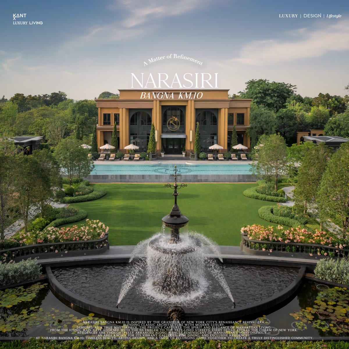 NARASIRI BANGNA KM.10 โครงการบ้านเดี่ยวสุดหรูล่าสุดจาก Sansiri ผู้พัฒนาอสังหาริมทรัพย์ที่สั่งสมชื่อชั้นและประสบการณ์มากว่า 40 ปี พร้อมที่จะส่งมอบนิยามของความหรูหราใหม่ให้กับลูกบ้านผู้ทรงเกียรติผ่านโครงการใหม่ล่าสุดนี้ แสนสิริ ได้ชื่อว่าเป็นนักพัฒนาอสังหาริมทรัพย์ที่แท้จริง ล่าสุดกับ New Luxury Community คือ Sansiri 10 East Community หนึ่งใน Sansiri Luxury Community เกิดเป็นสังคมคุณภาพ และมอบความเป็นส่วนตัว นำเสนอบ้านเดี่ยวระดับ Luxury ที่เชื่อมโยงรสนิยมและไลฟ์สไตล์ของผู้พักอาศัยเข้ากันได้อย่างเหนือระดับ โครงการ NARASIRI BANGNA KM.10 ตั้งอยู่บนทำเลไพร์มที่เป็น THE NEXT Eastern CBD of Bangkok ที่ดีที่สุดแห่งหนึ่งบนถนนบางนา-ตราด บนเนื้อที่โครงการรวมกว่า 38 ไร่ เอกสิทธิ์เพียง 56 ครอบครัวเท่านั้น ราคา 60-150 ล้านบาท* จากภาพมุมกว้าง เราจะเห็นได้ว่ามีพื้นที่ใหญ่มาก จาก Main Gate สูง 12 เมตร ดีไซน์สไตล์ New York Renaissance Revival ด้านหน้าประดับสัญลักษณ์ NS อักษรย่อของโครงการ โดดเด่นด้วยสระว่ายน้ำที่ประดับสัญลักษณ์ NS ไว้อย่างงดงามเช่นกัน พื้นที่ส่วนกลางยังร่มรื่นเต็มไปด้วยสีเขียวของต้นไม้ ทำเลของโครงการนับว่าเป็น Rare Item ที่หาได้ยากยิ่ง ตั้งอยู่บนจุดยุทธศาสตร์ที่สามารถเชื่อมต่อกับทุกเส้นทางสำคัญของกรุงเทพฯ ไม่ว่าจะเป็นถนนบางนา-ตราด, ถนนศรีนครินทร์, ถนนกาญจนาภิเษก วงแหวนรอบนอก, ทางพิเศษสาย S1 (บางนา– อาจณรงค์), ทางแยกต่างระดับศรีเอี่ยม, ทางพิเศษบูรพาวิถี อีกทั้งยังอยู่ใกล้สถานีรถไฟฟ้าสายสีเหลือง ทำให้การเดินทางสู่ใจกลางเมืองเป็นเรื่องง่ายดาย รายล้อมด้วยสิ่งอำนวยความสะดวกครบครัน ใกล้สนามบินสุวรรณภูมิ, สนามกอล์ฟ ซัมมิท วินด์มิลล์, TOP GOLF THAILAND, ดีไซน์ วิลเลจ บางนา, ห้างสรรพสินค้าเมกา บางนา, Market Village, พาราไดซ์ พาร์ค, ชิค รีพับลิก บางนา, รวมถึงเมกะโปรเจกต์ในอนาคตอย่าง Bangkok Mall ศูนย์การค้าระดับเวิลด์คลาสแห่งใหม่ ใหญ่ที่สุดในเอเชียตะวันออกเฉียงใต้ นอกจากนี้ยังมีร้านอาหารชื่อดัง, คาเฟ่ และอื่นๆ อีกมากมาย ทั้งยังใกล้สถานศึกษา อาทิ โรงเรียนนานาชาติเวอร์โซ, โรงเรียนนานาชาติเบิร์คลีย์, โรงเรียนนานาชาติคอนคอร์เดียน, โรงเรียนนานาชาติบางกอกพัฒนา, โรงเรียนนานาชาติ D-Prep, โรงเรียนนานาชาติราฟเฟิลส์อเมริกา, โรงเรียนนานาชาติ ไทย-สิงค์โปร์ และ โรงเรียนนานาชาติเซนต์แอนดรูว์ส เป็นต้น ทำให้เหมาะสำหรับครอบครัวที่มองหาการอยู่อาศัยที่มีคุณภาพในทุกด้าน ฯลฯ ส่วนสถานพยาบาลใกล้เคียง ได้แก่โรงพยาบาลสมิติเวช ศรีนครินทร์,โรงพยาบาลสิรินธร โรงพยาบาลพริ้นซ์ สุวรรณภูมิ โรงพยาบาลสินแพทย์ ศรีนครินทร์ โรงพยาบาลไทยนครินทร์และโรงพยาบาลสมิติเวช ศรีนครินทร์ เป็นต้น บรร
