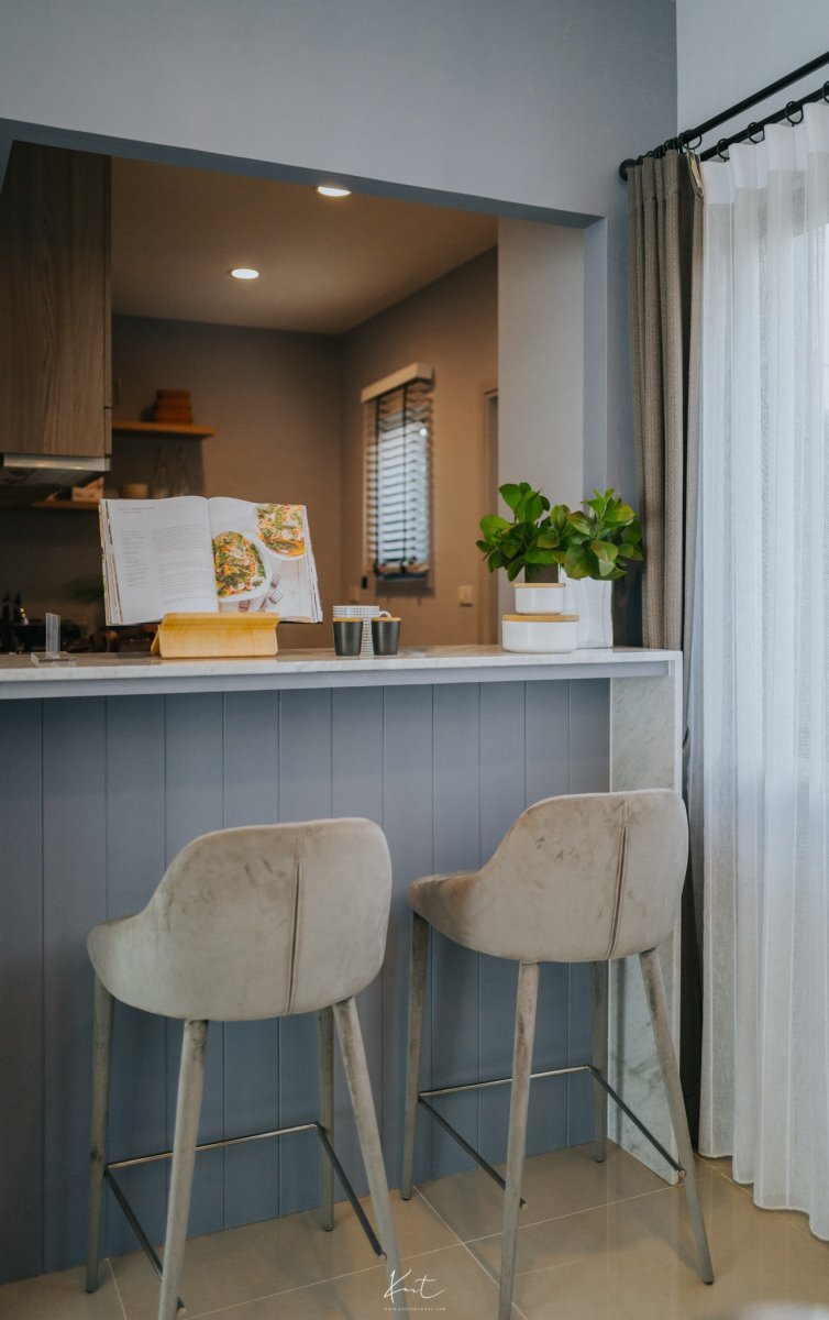 ด้านในเป็นส่วนของมิมิบาร์ พื้นที่จัดเตรียมอาหารและครัว เชื่อมต่อกัน มีประตูทางออกไปยังด้านหลังบ้านซึ่งเป็นส่วนซักล้าง หรือจะทำเป็นครัวไทยก็ได้ครับ