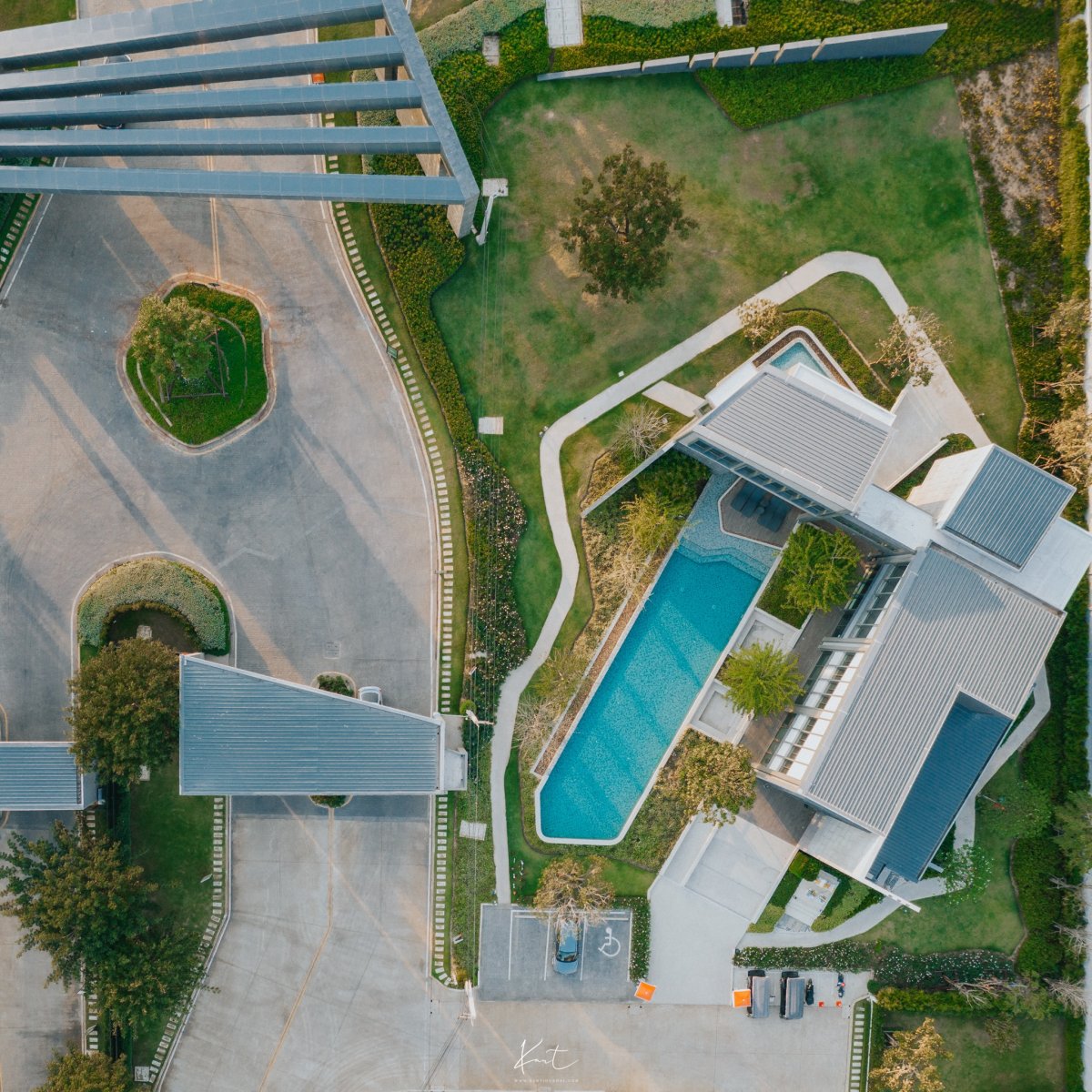 จากภาพมุมสูงจะเห็นคลับเฮ้าส์ ดีไซน์ผังได้สวยงาม ตั้งแต่ทางเข้า มาจนถึงอาคารและสวนด้านหน้า พร้อม สโมสร สระว่ายน้ำ ฟิตเนสเซ็นเตอร์ Co-Working Room และมี Kids Club สำหรับเด็กด้วย