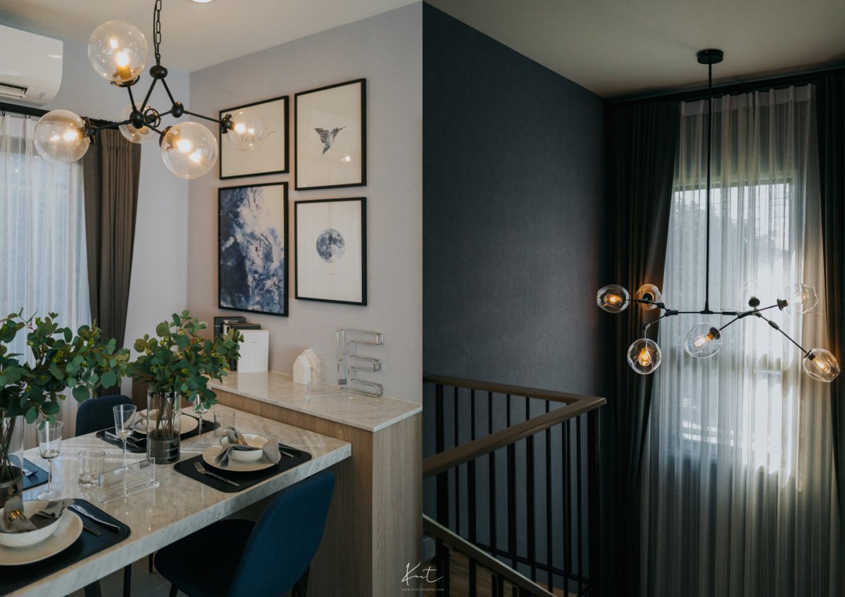 ผมชอบการออกแบบตกแต่งภายในของ SC Asset ที่มีกิมมิคซ่อนอยู่ในงานดีไซน์ อย่างบ้านหลังนี้ก็คุมโทนสีน้ำเงินพร้อมกับ Curve ด้วยโคมไฟทรงกลมทั้งโต๊ะอาหารและโถงบันได ที่เชื่อมต่อกันได้ดีและลดทอนความแข็งกระด้างของบ้าน