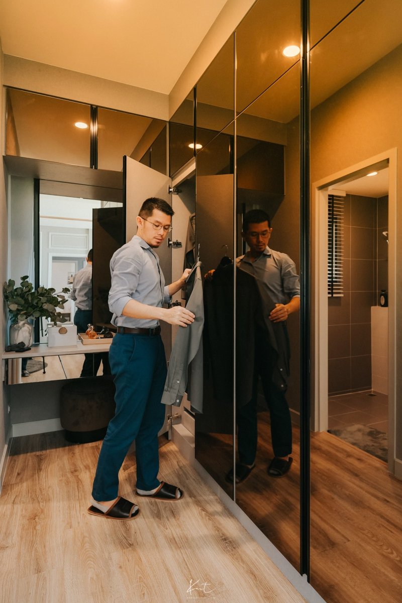 ส่วนฝั่งตรงข้ามของห้อง เป็นมุมด้านในจัดฟังก์ชั่นเป็นพื้นที่สำหรับแต่งหน้าและแต่งตัว Built in ทำเป็น Walk-in Closet