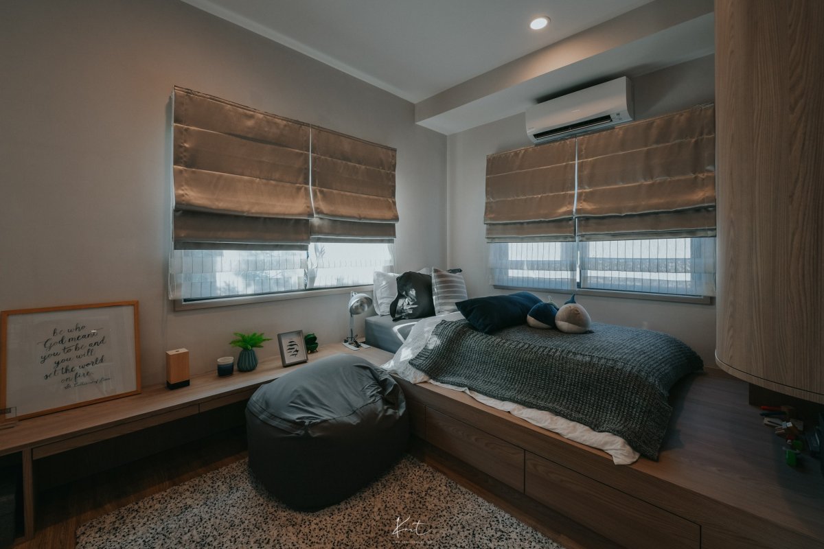 ติดกันจะเป็นห้องนอน 2 และ 3 ด้านในสุดจะอยู่โซนด้านหลังบ้าน จัดเป็นห้องนอนเด็กได้ จริงๆ แล้วก็วางเตียง 5 ฟุตได้สบายๆ เลยนะ แต่พอห้องตัวอย่างจัดเป็นเตียงสไตล์ยกพื้นแบบญี่ปุ่น ขนาด 3.5 ฟุต ทำให้ห้องดูกว้างขึ้น