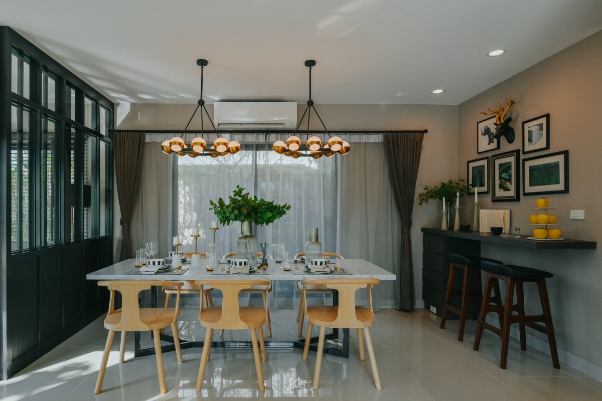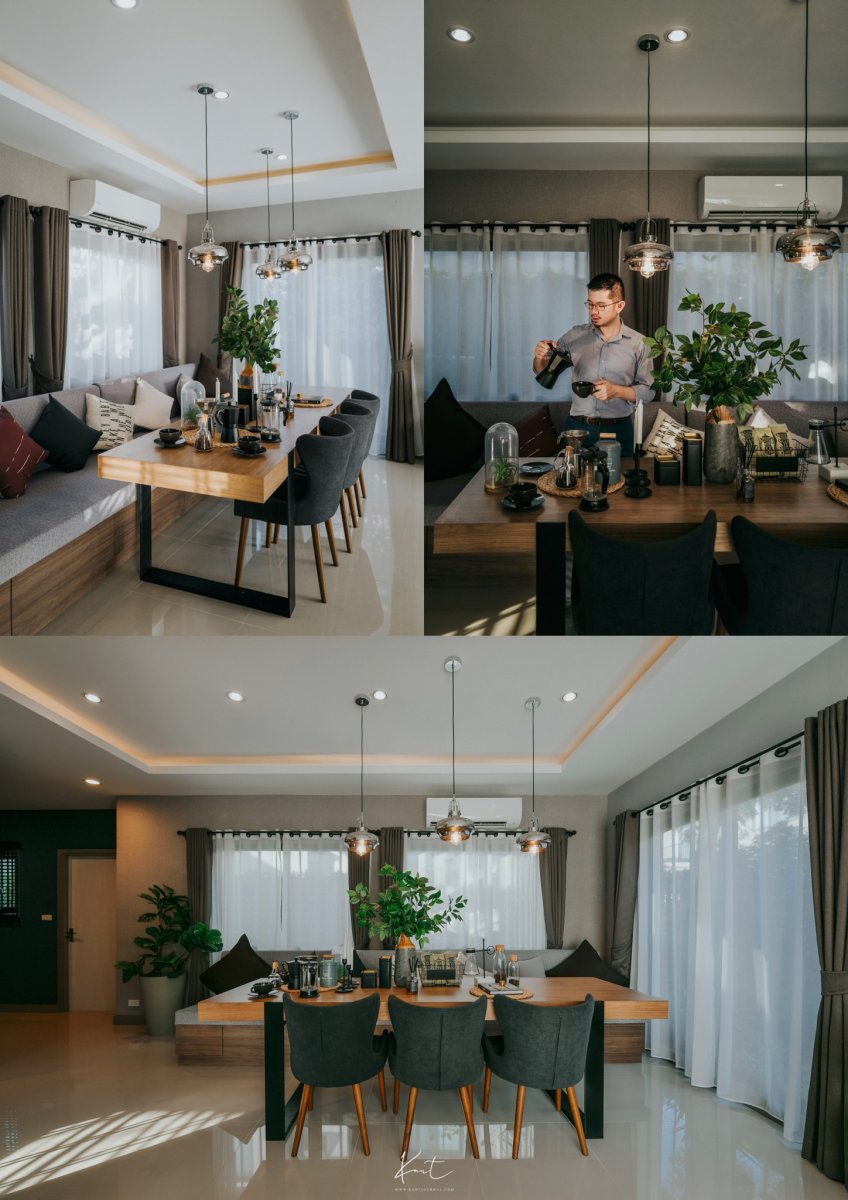 โถงกลางบ้าน หรือ Common Area เชื่อมต่อกับมุมรับแขกด้านหน้า เข้ามาเป็นรูปตัวแอลเช่นกันยาวไปจนถึงส่วนครัว มุมนี้จัดเป็นโต๊ะรับประทานอาหารคือนั่งทำงานได้สบายๆ