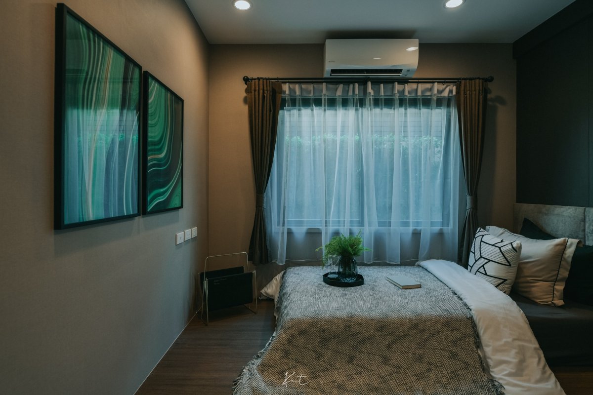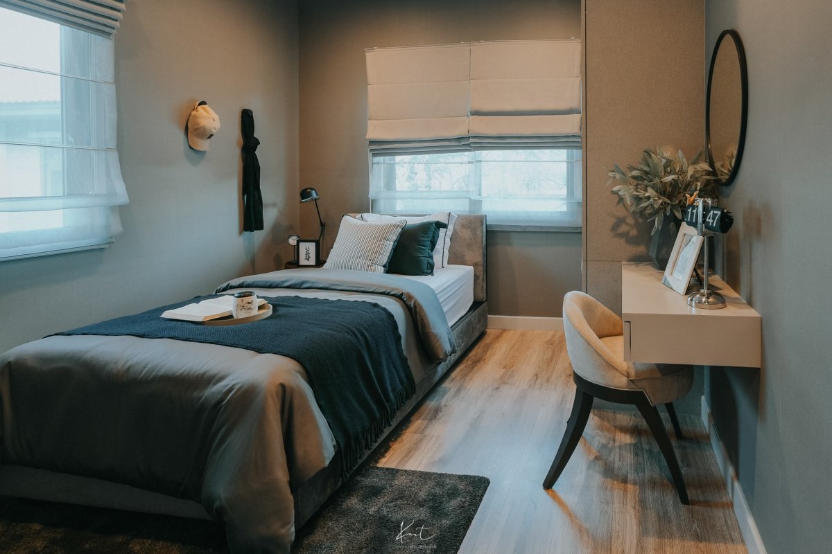 ส่วนด้านหลังสุด มีอีกห้องนอนที่จัดให้ดูเป็นวัยรุ่นขึ้นมาหน่อย คุมโทนสีขรึมๆ ให้ดูมีสไตล์ มุมด้านหลังบ้านผมว่าเงียบดี ออกแบบให้เป็นห้องทำงาน ห้องอ่านหนังสือหรือเป็นเธียเตอร์ก็เข้าท่าดีนะครับ