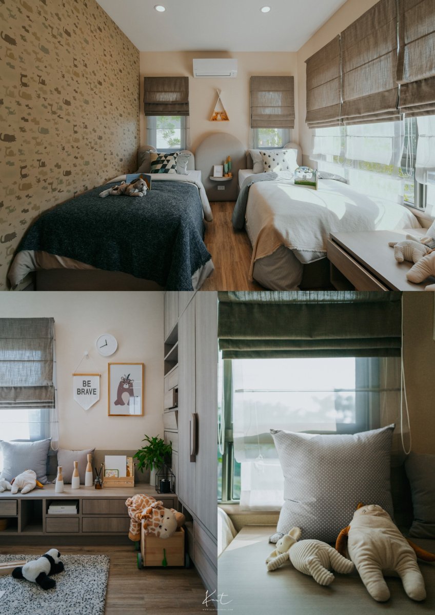 ด้านบนจะมีห้องนอนเล็ก เริ่มจากห้องนอนด้านขวาถัดจากห้องนอนหลัก จัดเป็นห้องสำหรับเด็ก วางไว้ขนาด 2 เตียง ฟิตกำลังดี พร้อมพื้นที่ปลายเตียง ให้เป็นมุมพักผ่อนเล่นของเล่นได้สบายๆ