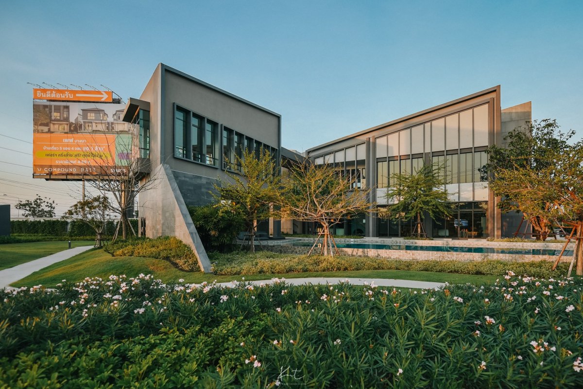 อาคาร Clubhouse ขนาดใหญ่ดีไซน์สวย ด้านหน้าจอดรถได้ 4 คัน ลักษณะเป็นอาคาร 2 ชั้นสไตล์ Modern มีมุมสามเหลี่ยมแบบนอร์ดิค ตามคอนเซปต์ของบ้าน รายล้อมไปด้วยสวนสีเขียวขนาดใหญ่และสระว่ายน้ำ