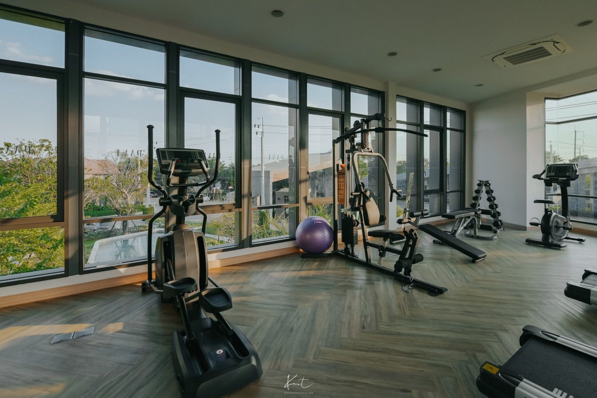 ฟิตเนสเป็นห้องโล่งกว้าง รายล้อมด้วยกระจกเพื่อเทควิวรอบด้าน ให้ความรู้สึกโปร่งโล่งสบาย หายใจได้สะดวก พร้อมเครื่องออกกำลังกายครบครัน