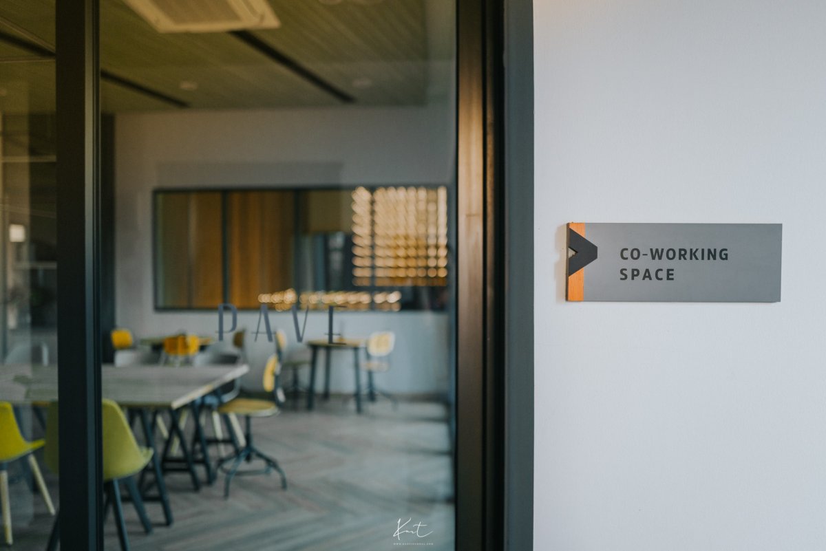 ชั้นบนเป็น Co-Working Space เป็นห้องขนาดใหญ่ที่จัดวางเฟอร์นิเจอร์สำหรับประชุม หรือนั่งทำงานได้สบายๆ พร้อมแสงธรรมชาติจากกระจกที่เชื่อมต่อภายนอก อีกด้านเจาะผนังใส่กระจกเงาเพื่อมองออกไปเป็นโคมไฟเชื่อมต่อกับพื้นที่ชั้นล่าง