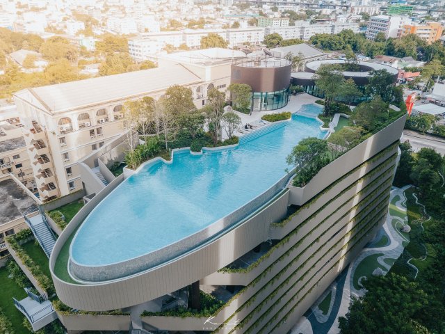 จากภาพมุมสูงจะเห็นว่ามีถึง 2 สระว่ายน้ำด้วยกัน และมี Beach Bar เอาไว้นั่งปาร์ตี้เบาๆ ด้วยครับ