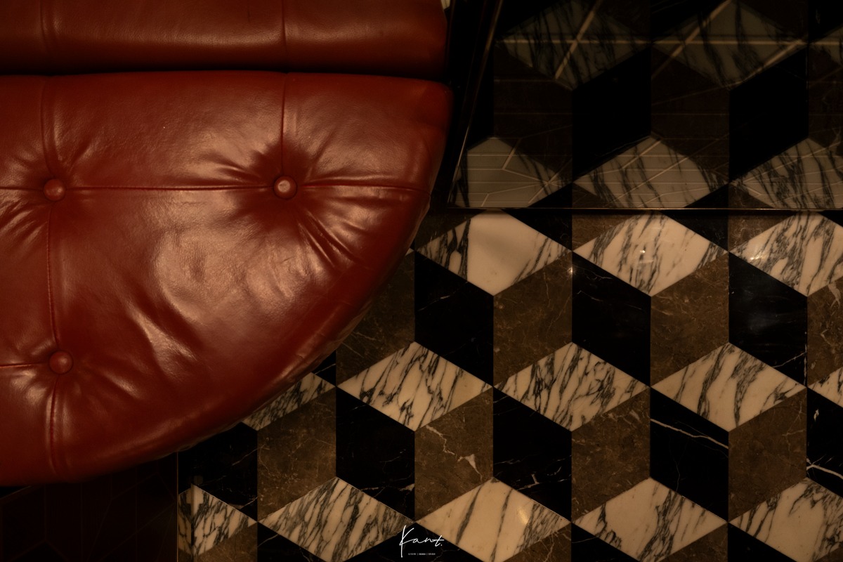 ในลิฟต์มีที่นั่งพักขาเบาๆ เป็นกิมมิคที่ชอบมาก เบาะเข้ากับลายกระเบื้องดี มีความวินเทจ