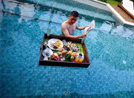 ส่วนใครที่อยากจะลองเปลี่ยนบรรยากาศใหม่ๆ ที่ สันติบุรี เขามีเซอร์วิส floating breakfast เสิร์ฟตรงถึงที่วิลลาซึ่งจะจัดมาในถาดที่ถูกออกแบบมาเป็นพิเศษให้ลอยน้ำได้ ซึ่งมีให้เลือกที่จะทานพร้อมกับแชมเปญหรือสปาร์คลิ่งไวน์ คู่กับน้ำผลไม้และชา กาแฟ