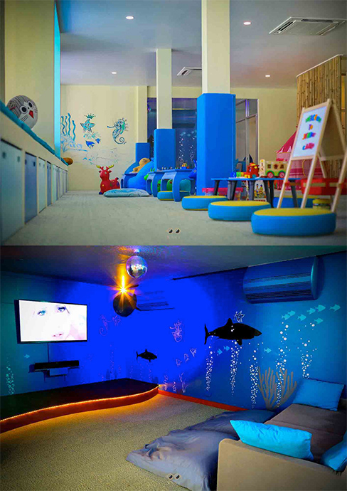 ผมชอบห้องดูหนังนี้มากเลยครับ ดูรีแลกซ์ เหมือนได้ดื่มด่ำอยู่ใต้ท้องทะเล คอนเซปต์คือ “Parents ‘Night Off” สำหรับคุณพ่อคุณแม่และลูกได้จูงมือกันออกจากห้องพักมาชมภาพยนตร์ร่วมกัน จะได้เพลิดเพลินและใช้เวลาที่มีคุณภาพด้วยกันในครอบครัว