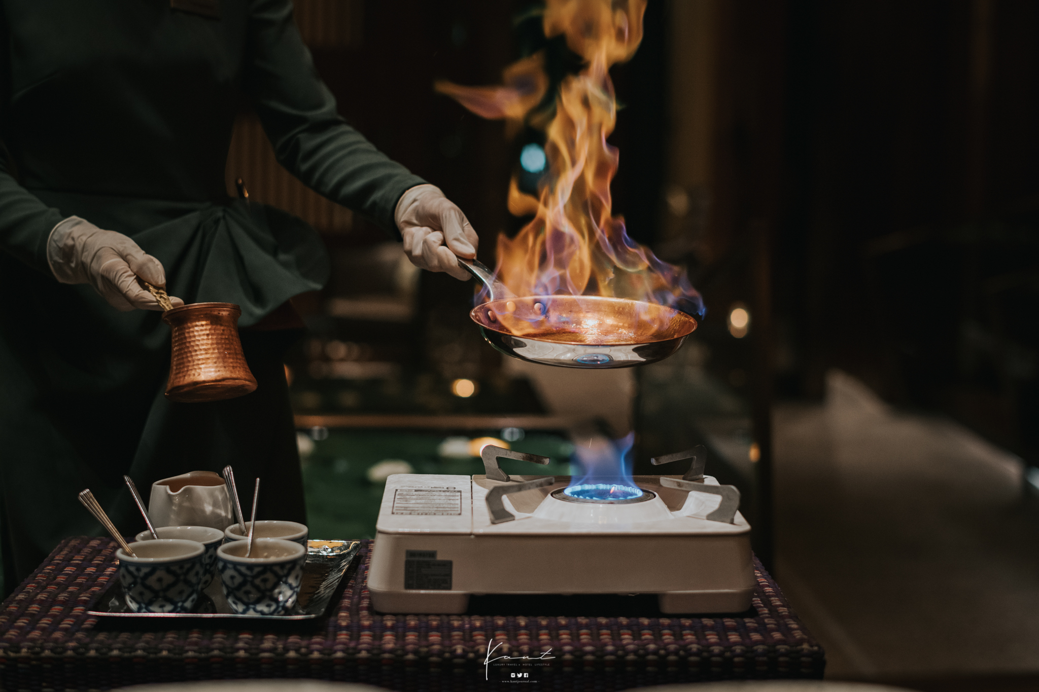 เมนูสตาร์ทเตอร์ จะเป็นเครื่องไซฟ่อนนำมาทำต้มยำกุ้ง มีตะไคร้ ใบมะกรูดและหัวกุ้ง จากนั้นคุณส้มจะติดไฟเพื่อให้เกิดความร้อน ใช้เวลาประมาณ 5-7 นาที เมื่อน้ำซุปร้อนได้ที่ก็จะขึ้นมาผสมกับเครื่องต้มยำด้านบน เป็นการอินฟิวที่ช่วยทำให้เราได้กลิ่นของเครื่องต้มยำที่ดีขึ้น