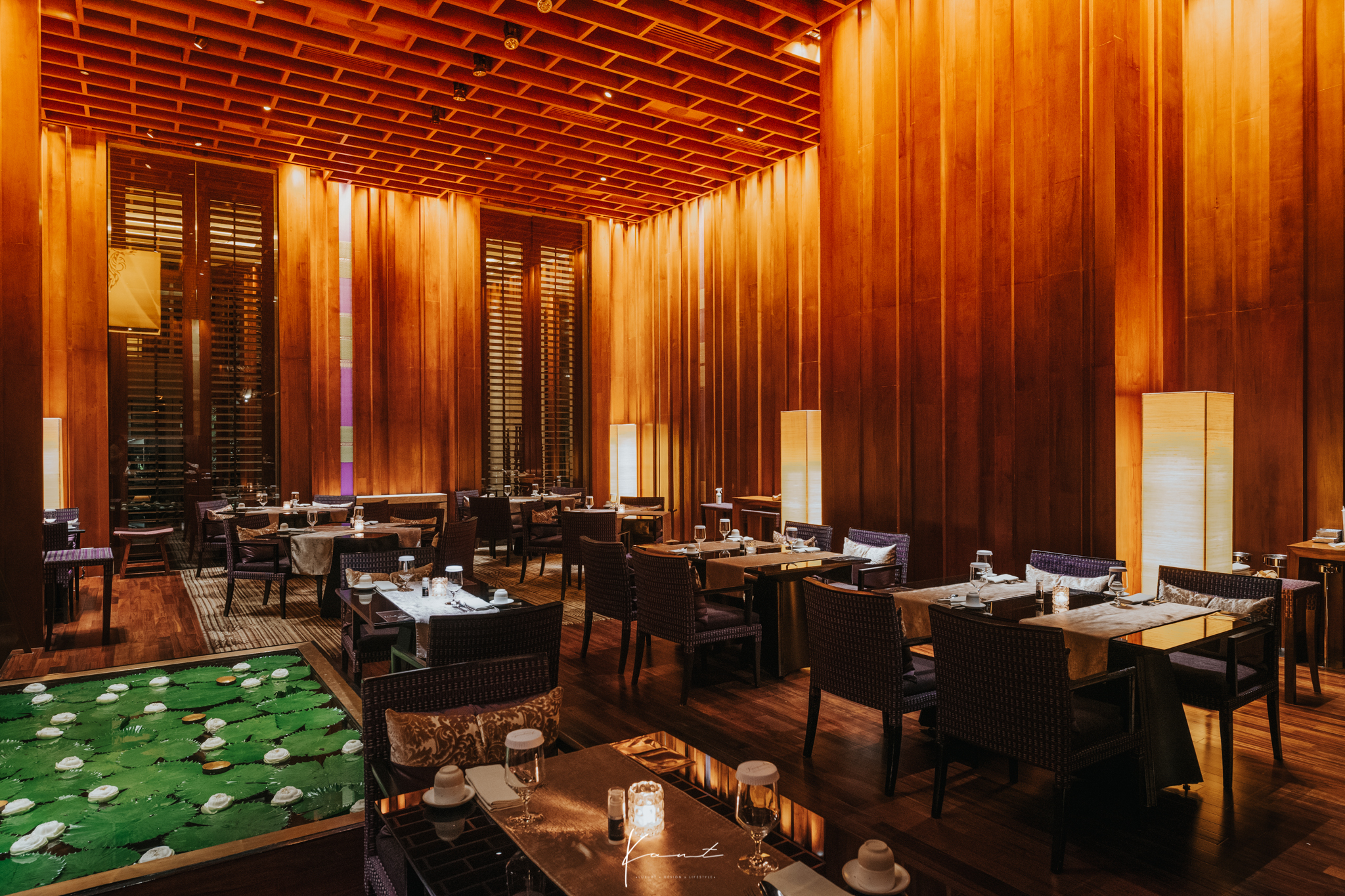 นั่งสักพัก พนักงานจะเชิญเราไปที่โต๊ะครับ เป็นห้องอาหารที่สวยอลังการงานสร้างแบบไทยๆ มาก รายล้อมด้วยสระบัวสีเขียวขาว มีโต๊ะศาลาไทยด้วย นำเสนอความเป็นไทยได้ดีสุดๆ