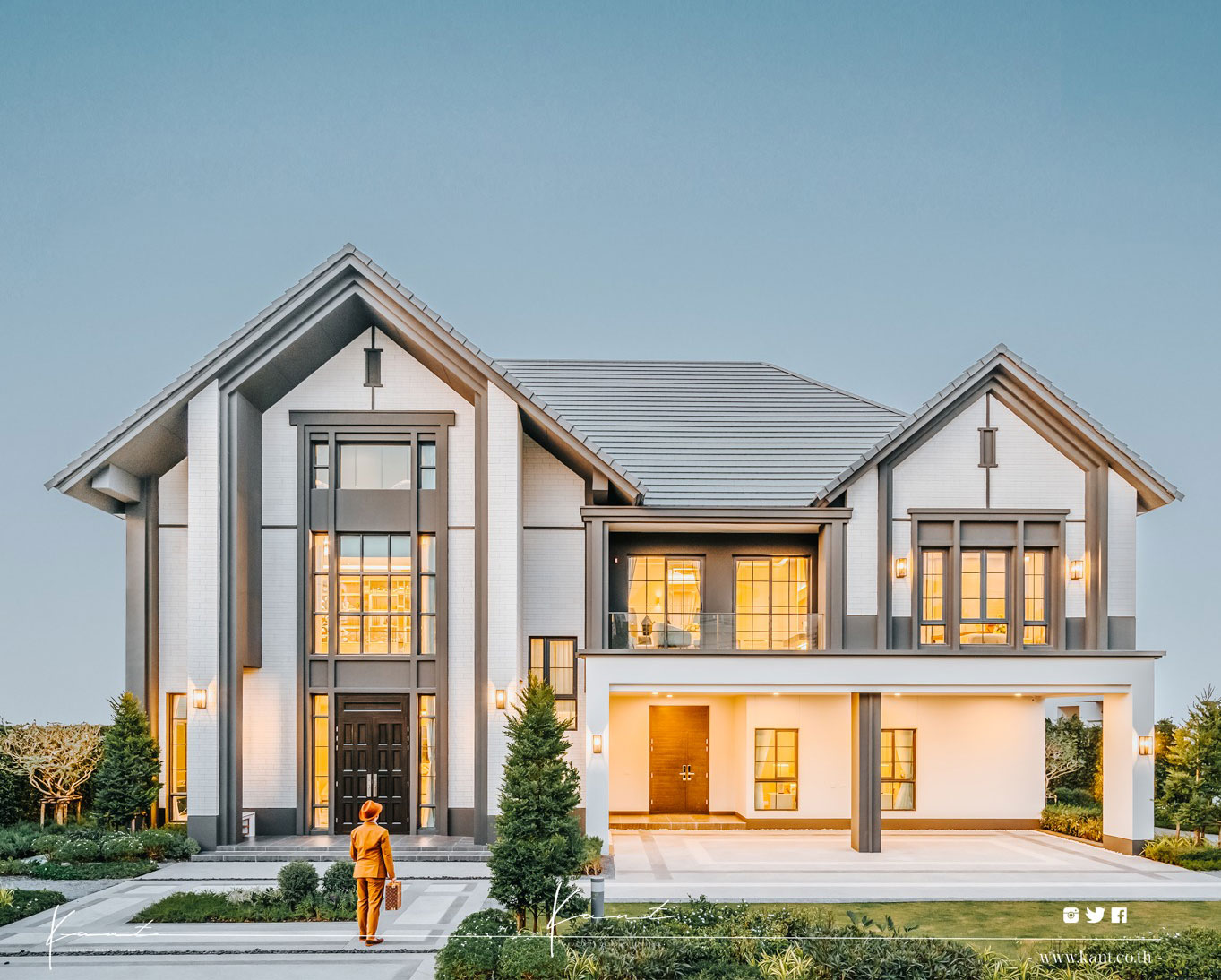 บ้านตัวอย่างที่กานต์พาไปชมมีขนาดใหญ่ที่สุดตั้งชื่อว่า Oxburgh ซึ่งยังคงเอกลักษณ์ของงานดีไซน์ที่มี Facade ด้านหน้าเป็นงานก่ออิฐ ผนังทาสีขาวตัดกับสีเทาควันบุหรี่สุดคลาสสิค หน้าต่างทรงสูงและแคบ เพื่อเปิดให้มีช่องแสงธรรมชาติที่ส่องเข้ามาเพียงพอ หลังคาแหลมสูงชันแบบเดียวกัน ผสมผสานการตกแต่งภายในที่เน้นเฟอร์นิเจอร์แบบดั้งเดิมและสมัยใหม่เข้าด้วยกัน เช่น มุมรับแขกจัดวางโซฟาหนังกลับรูปทรงวินเทจเย็บกระดุม โต๊ะรับประทานอาหารหินอ่อนสุดหรูหรา หน้าต่าง Powder Coating สีดำพร้อมกระจกใสเปิดรับวิวสวนสไตล์อังกฤษที่รายรอบ เหล่านี้สามารถสร้างบรรยากาศของบ้านสไตล์อังกฤษได้อย่างมีเอกลักษณ์และน่าสนใจ เพราะผสมผสานสิ่งที่ดีที่สุดของทั้งสองยุคสมัยเข้าด้วยกัน เป็นการสร้างสภาพแวดล้อมการอยู่อาศัยที่สวยงาม สะดวกสบายและใช้งานได้จริง