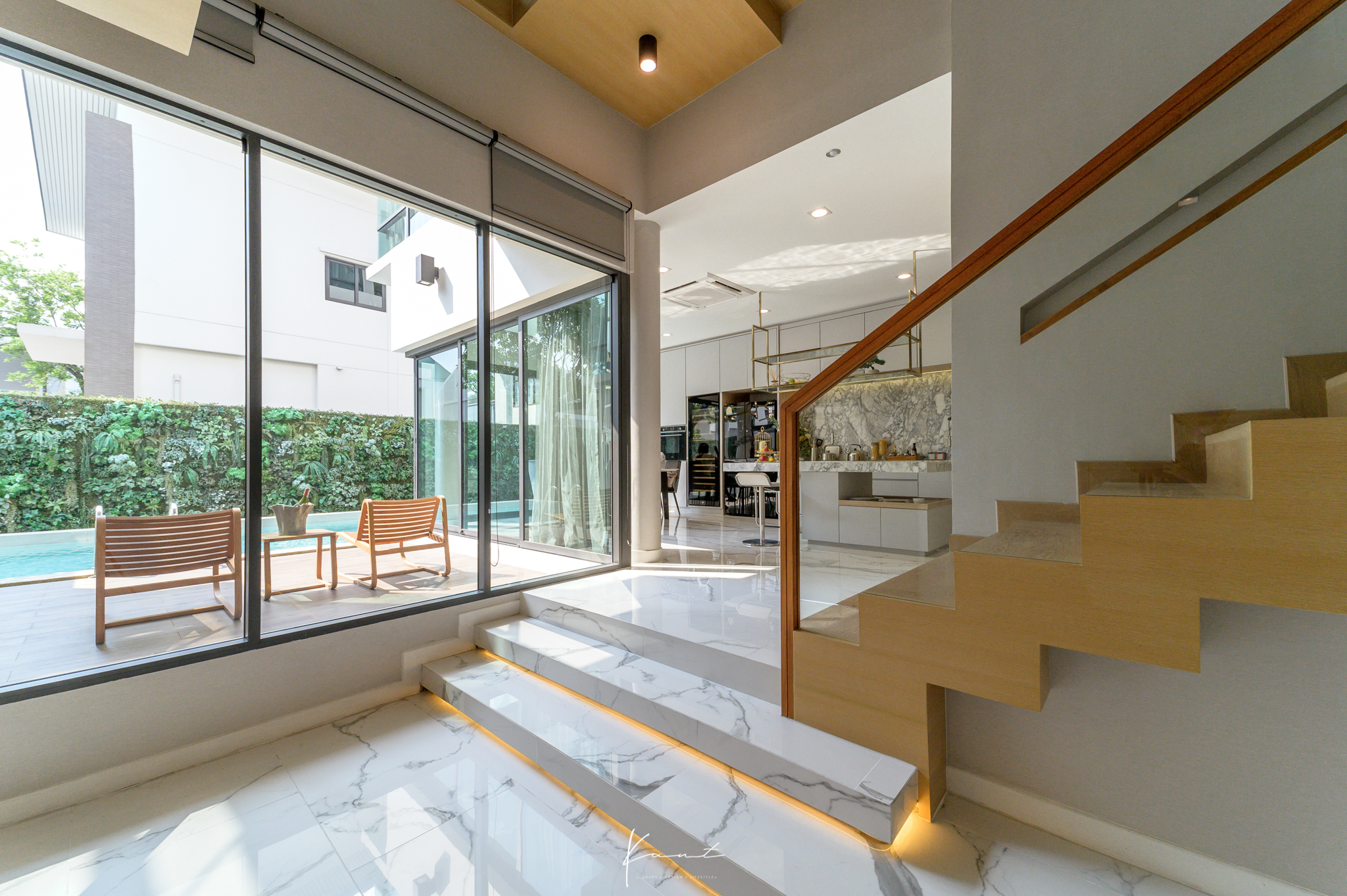 เราสามารถเลื่อนเปิดประตูออกไปได้ ทำให้เรามองเห็น Terrace และวิวสระว่ายน้ำสีฟ้าภายนอกบ้าน เพิ่มความสดชื่นสบายตา มองเข้าไปจะเห็น Dining Area ด้านใน เชื่อมต่อกับบันไดด้านขวา