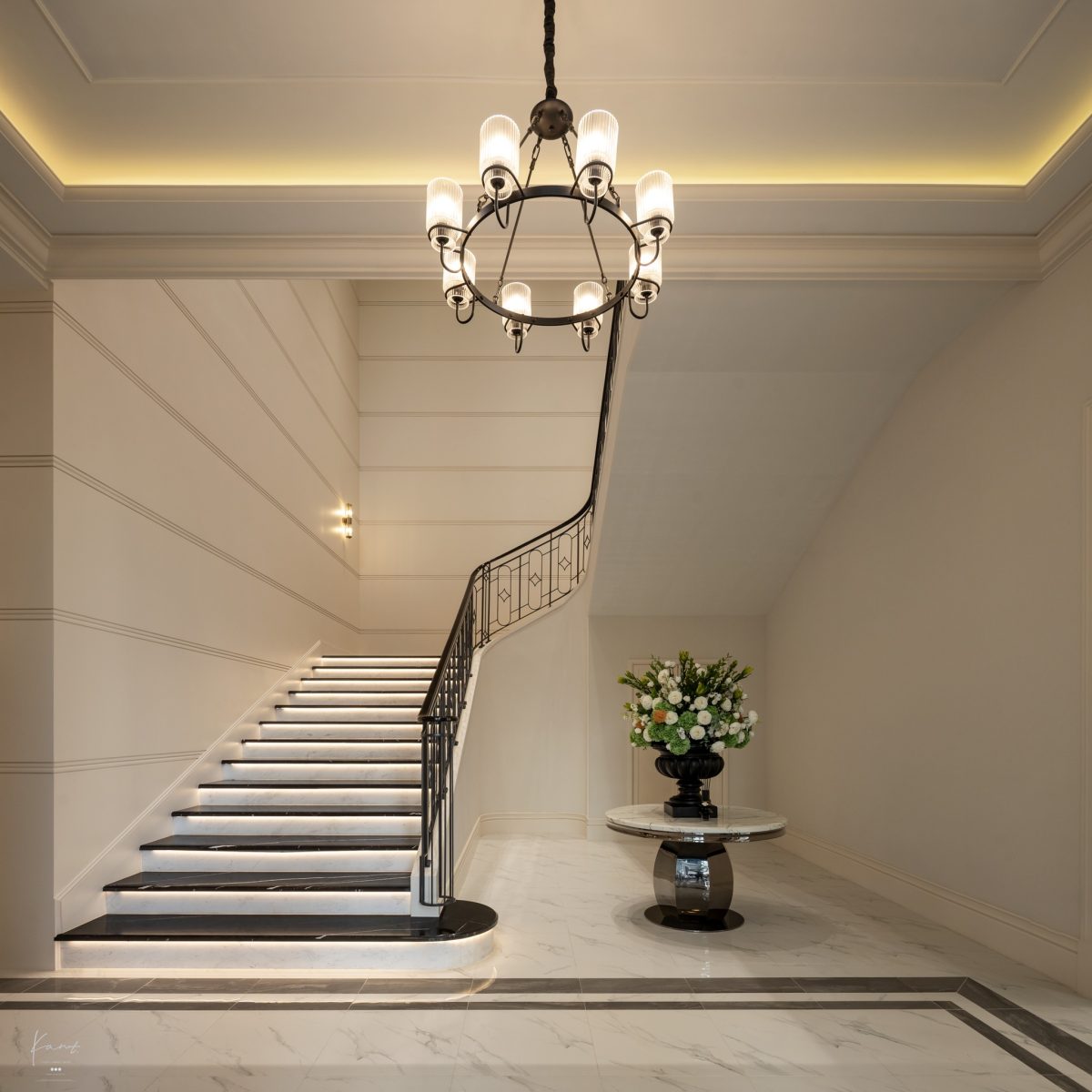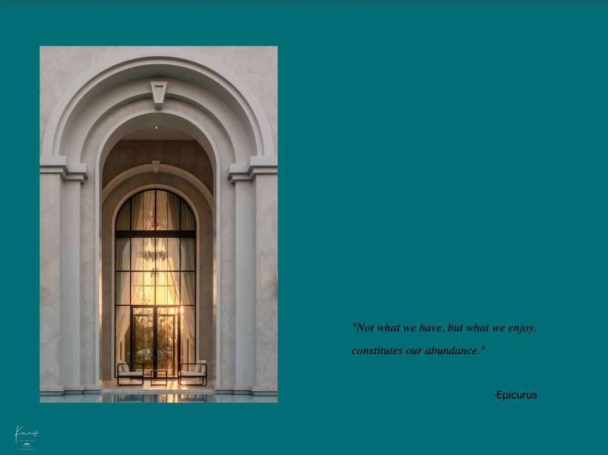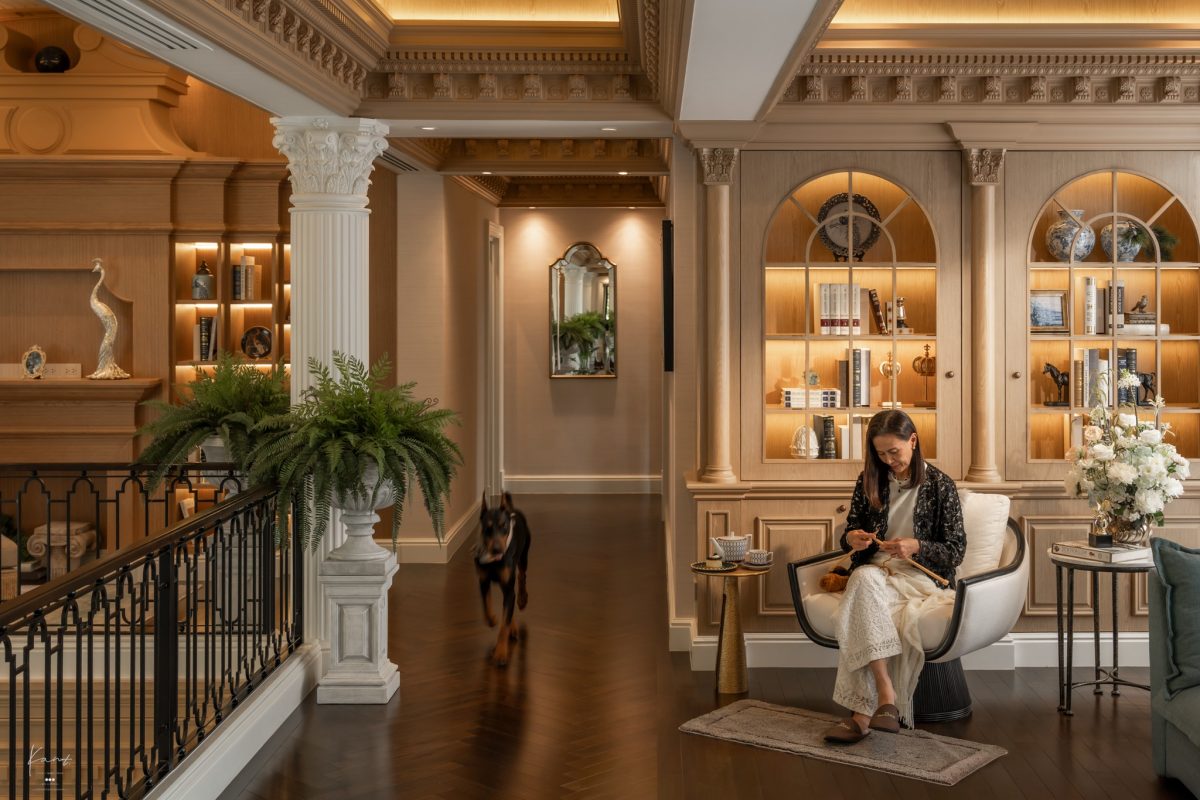 กานต์ว่าความสูง 9 เมตรไม่ใช่ตัวเลขที่เกิดขึ้นโดยบังเอิญ มันคือการออกแบบอย่างตั้งใจเพื่อให้เราสัมผัสได้ถึง Grandeur ตั้งแต่ก้าวแรก เหมือนการก้าวเข้าสู่ Hall ของโรงแรมระดับ Palace ในยุโรปที่ทุกอย่างถูกคำนวณมาเพื่อสร้างความรู้สึกว่า “เราได้ใช้ชีวิตอยู่ในสถานที่พิเศษกับคนพิเศษ”