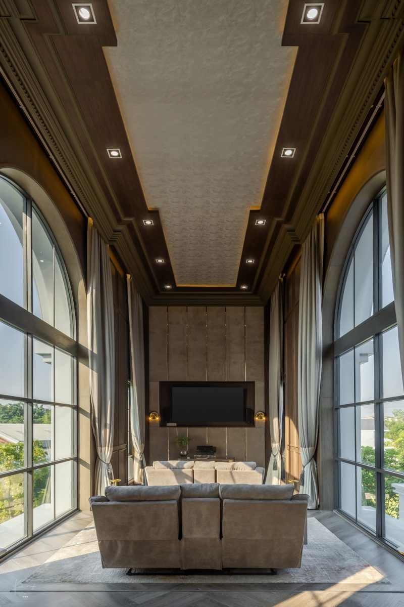 ความน่าสนใจอยู่ที่การออกแบบพื้นที่ให้ห้องนั่งเล่น ห้องรับประทานอาหาร และ Pantry เชื่อมต่อกันเป็นผืนเดียว โดยมีเพดาน Double Volume ทรงโค้งแบบ Barrel Vault พร้อมซ่อนไฟ Cove Lighting ที่ดูนุ่มนวล ให้บรรยากาศคล้ายกับโถงโบสถ์ในยุโรปมากกว่าจะเป็นแค่บ้านพักอาศัยทั่วไป