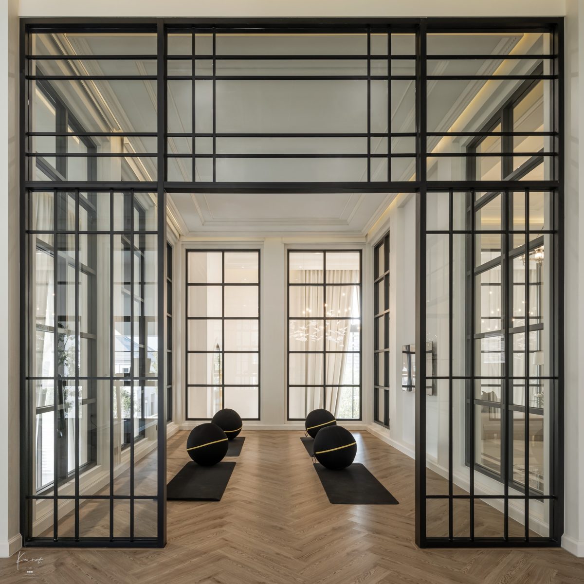 อีกหนึ่งสิ่งที่ช่วยเพิ่มเสน่ห์ให้กับตัวอาคาร หน้าต่างกระจกใสกรอบสีดำที่ทำให้เกิดจุดเด่นที่ช่วยเสริมความหรูหราให้กับ Clubhouse นอกจากจะเป็นองค์ประกอบที่สะท้อนความงามแบบยุโรปแล้ว ยังเปิดรับแสงธรรมชาติให้ส่องผ่านเข้ามาภายในอย่างพอดี ทำให้พื้นที่ภายในดูโปร่งโล่งและอบอุ่นในเวลาเดียวกัน