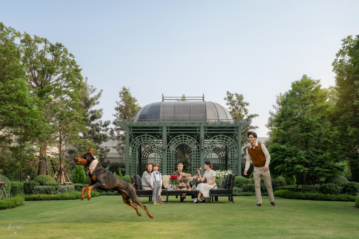 พื้นที่สีเขียวส่วนกลางของโครงการมีขนาดใหญ่กว่า 1 ไร่ ออกแบบตามแนวคิด Formal European Garden สนามหญ้าที่กว้างขวาง มี Garden Pavilion ทรงกลมที่เป็นจุด Focal Point ของสวน ปลูกต้นไม้นานาพันธุ์ที่จัดวางอย่างมีจังหวะ ตั้งแต่ไม้โปร่งที่ยอมให้แสงแดดส่องผ่านในเวลาที่พอดี พุ่มไม้และไม้ดอกที่เพิ่มสีสันตามฤดูกาล ไปจนถึงไม้ยืนต้นที่สร้างร่มเงาและมิติให้กับพื้นที่ได้อย่างงดงาม