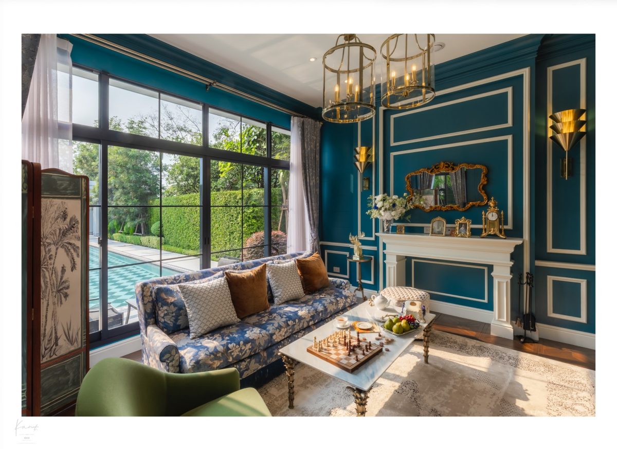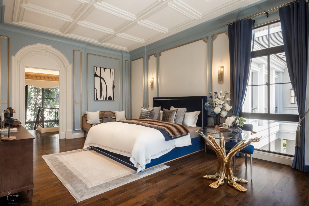 กานต์ชอบห้องนี้มากด้วยการจับคู่น้ำเงิน French Blue กับสีเหลืองทองของคิ้วบัวสีทองและฝ้าเพดานสีขาว เป็นการเล่นกับสีและสเปซได้สนุกแต่ยังคงความหรูหราไว้เต็มเปี่ยมครับ