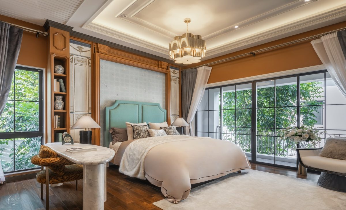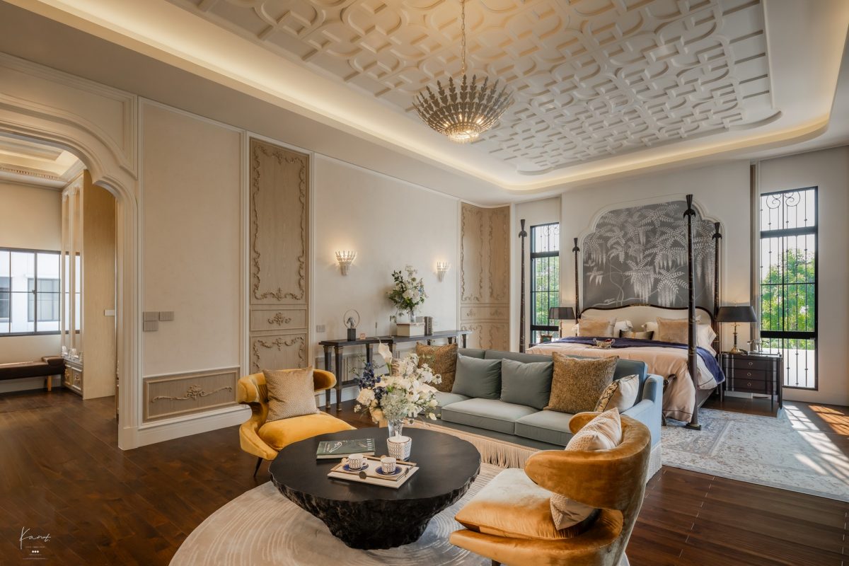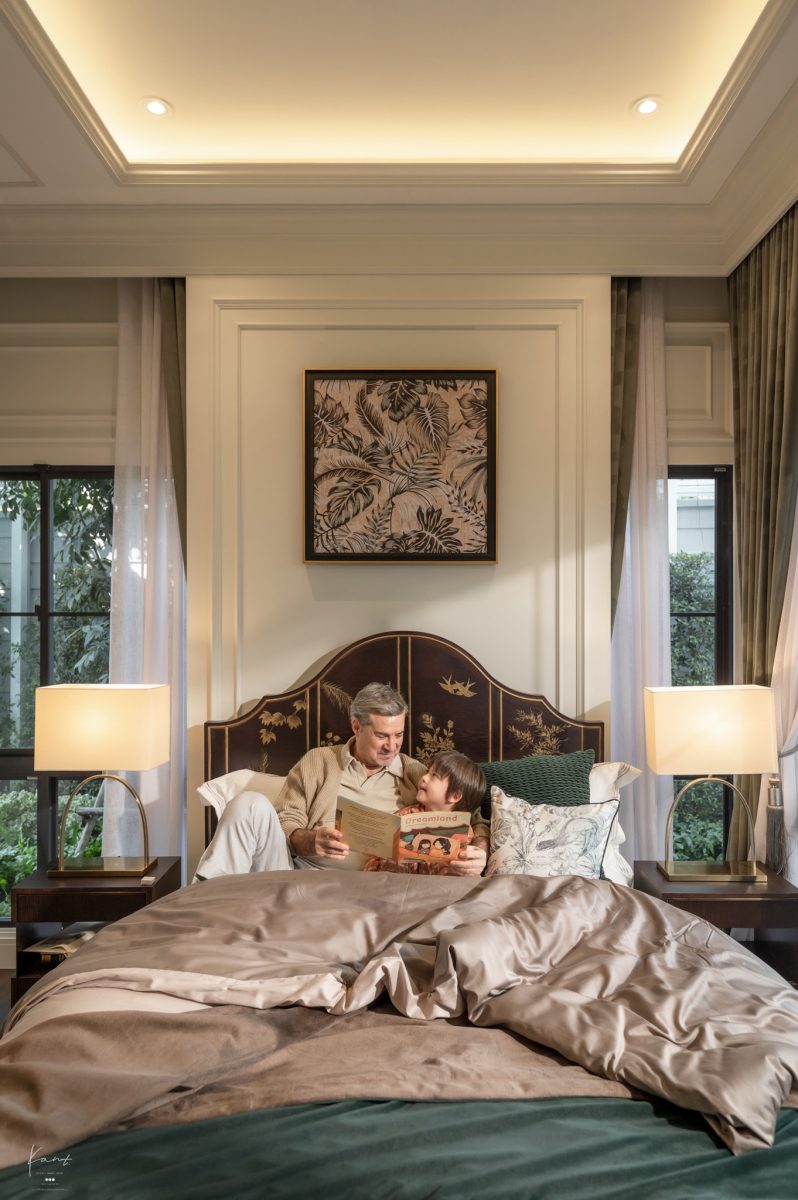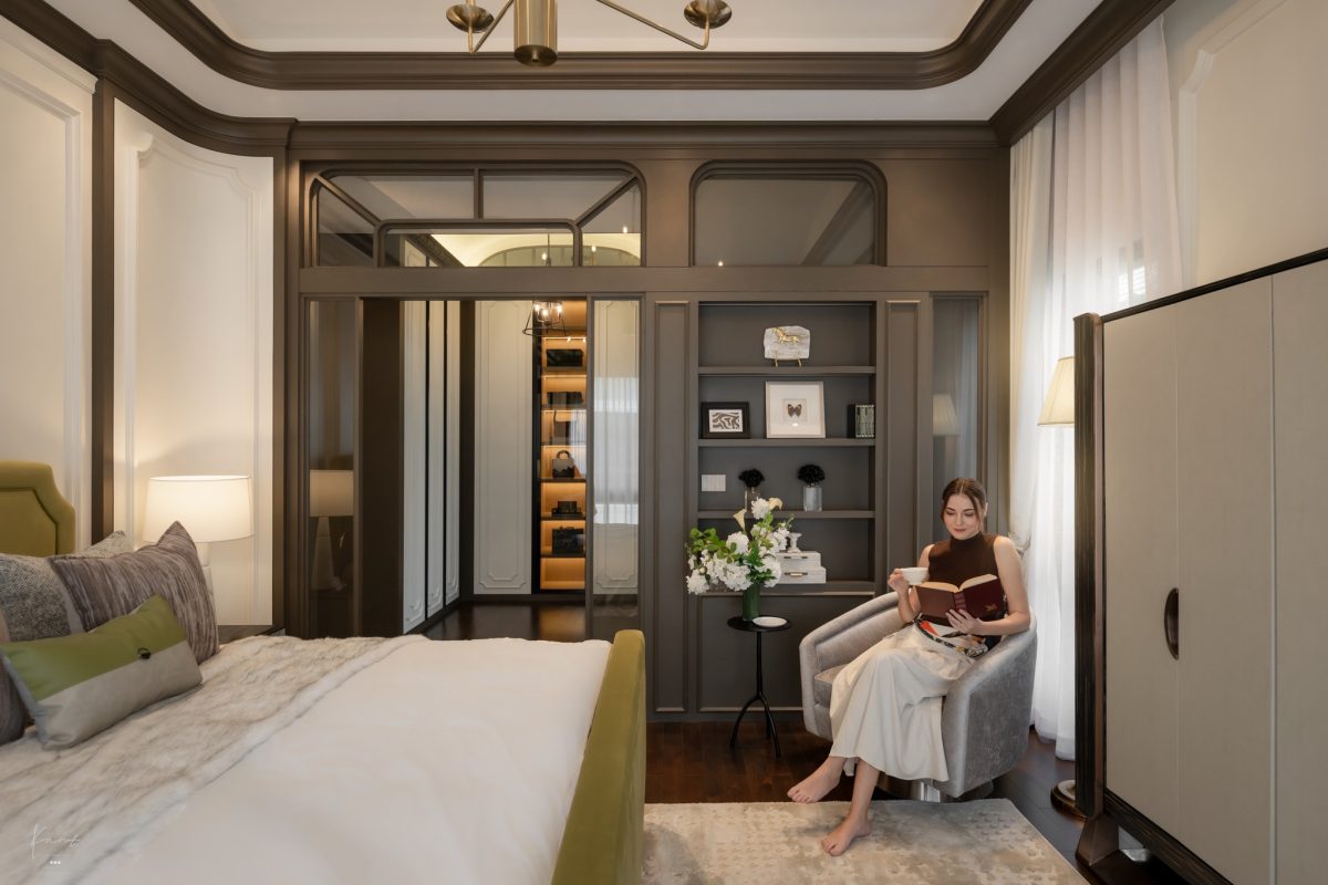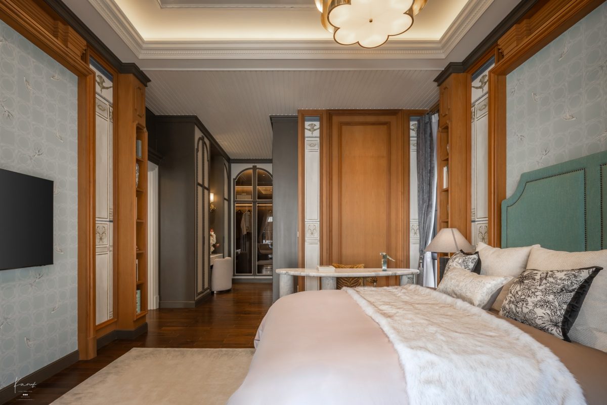 Grand Master Bedroom ได้รับการออกแบบสเปซให้เป็นเหมือน Personal Empire หรืออาณาจักรส่วนตัวอย่างแท้จริงครับ โดยก่อนจะเข้าถึงห้องนอนด้านใน เราจะเดินผ่านโถงทางเดินที่ให้ความรู้สึกเหมือนแกลเลอรีขนาดย่อม ผนังตกแต่งด้วยงานกรุไม้และบัวปูนปั้นที่ทำออกมาได้ประณีตมาก เป็นมุมที่ตั้งใจออกแบบมาให้แขวนภาพความทรงจำดีๆ ร่วมกัน สร้างสเปซที่เชื่อมโยงความรู้สึกและเป็นจุดพักสายตาที่อบอุ่นก่อนจะก้าวเข้าสู่พื้นที่พักผ่อนส่วนตัว