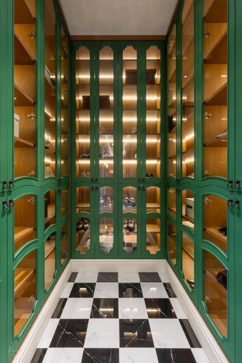 ขณะเดียวกันมีห้องแยกด้านหน้าบ้านที่ออกแบบเป็น Shoes Storage ขนาดใหญ่เลือกใช้สีเขียวมะกอก จัดเป็นรูปตัวยู ใช่้เป็นพื้นที่สำหรับจัดเก็บรองเท้า หรือจะใช้เป็นห้องเก็บของเช่นถุงกอล์ฟ หรือเก็บกระเป๋าเดินทางขนาดใหญ่ก็ได้เช่นกัน เรียกได้ว่าเป็นบ้านสำหรับคนที่ชอบเดินทางแบบกานต์เลยครับ