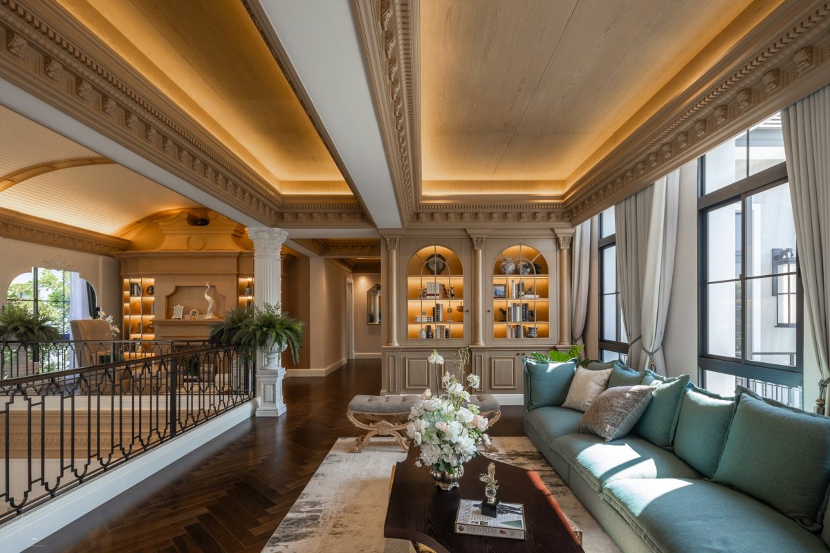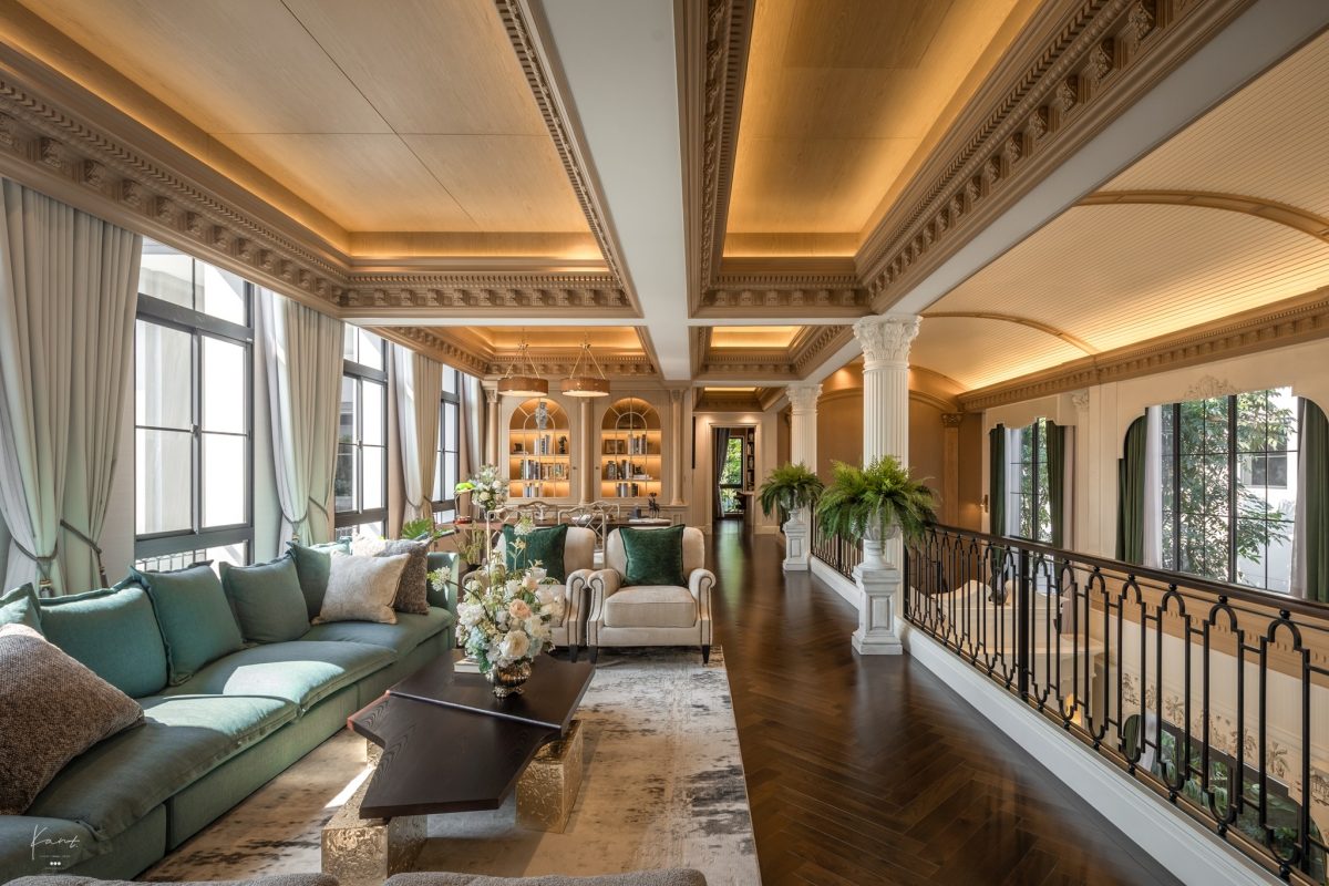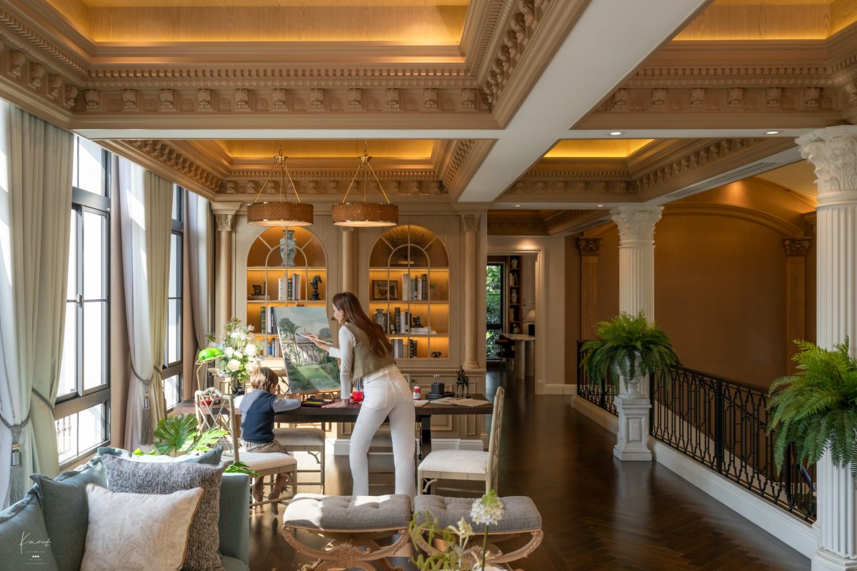 Family Area ชั้นบนของ THE PALAZZO ปิ่นเกล้า-บรมฯ ออกแบบและตกแต่งมาอย่างหรูหราและสมรายละเอียด ไม่ว่าจะเป็นเพดานกรุไม้ที่ซ่อนไฟให้แสงดูละมุน งานบัวเพดานเก็บดีเทลลวดลายอย่างละเอียด ไปจนถึงพื้นไม้ลายก้างปลาสีเข้มที่ให้ความรู้สึกอบอุ่น พร้อม Cove Lighting สีทองช่วยให้แสงกระจายทั่วถึงทุกมุมโดยไม่มีจุดใดอึดอัด โดยมีเสา Corinthian สีขาวที่ตั้งขนาบราวระเบียงเหล็กดัดช่วยแบ่งพื้นที่โดยไม่ต้องสร้างกำแพงกั้น ช่วยเชื่อมทุกมุมให้รู้สึกเป็นเรื่องราวเดียวกันครับ