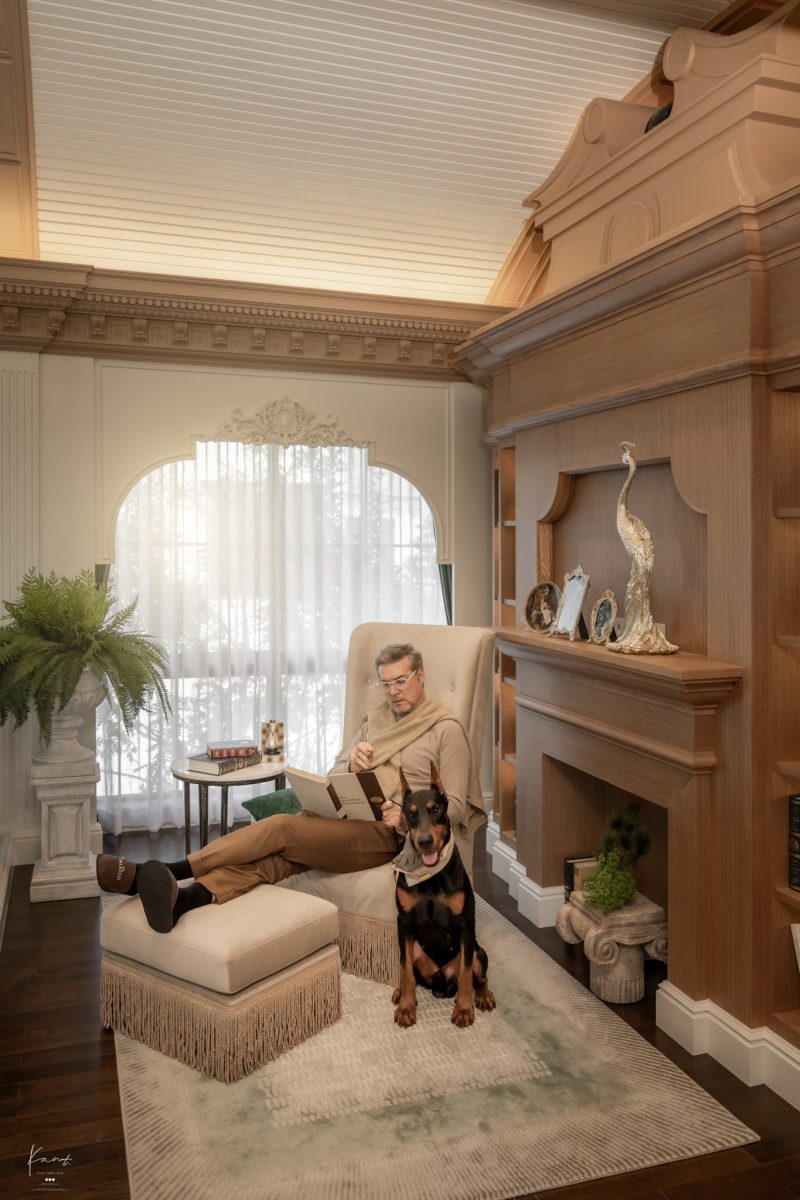 คุณปู่เลือกนอนเหยียดยาวบน Wing Chair หน้าเตาผิงหินแกะสลัก มีน้องหมาตัวโปรดแนบอยู่ข้างๆ แสงธรรมชาติผ่านหน้าต่างโค้งทรง Arch ส่องผ่านผ้าม่านขาวโปร่งเข้ามาพอดีครับ ทั้งหมดนี้เกิดขึ้นพร้อมกันในพื้นที่เดียว โดยไม่มีใครรู้สึกว่าตัวเองกำลังขัดจังหวะใคร