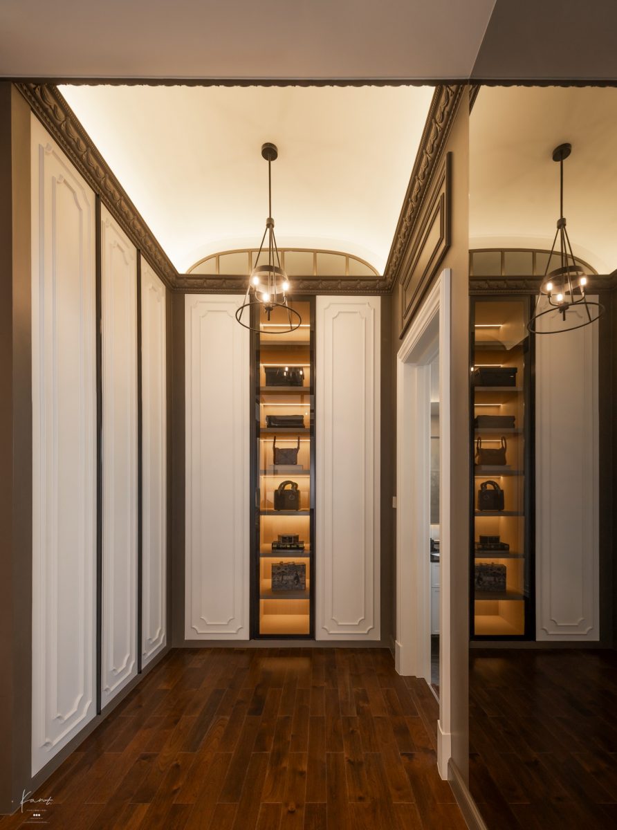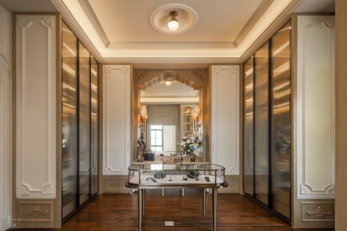 ด้านในเป็น Walk-in Closet ที่จัดวาง Island ไว้ตรงกลางสำหรับดิสเพลย์เครื่องประดับ ขนาบข้างด้วยตู้เสื้อผ้าหน้าบานกระจกใสที่ซ่อนไฟด้านในเพื่อช่วยยกระดับประสบการณ์การแต่งตัวในทุกๆ วันให้พิเศษขึ้น