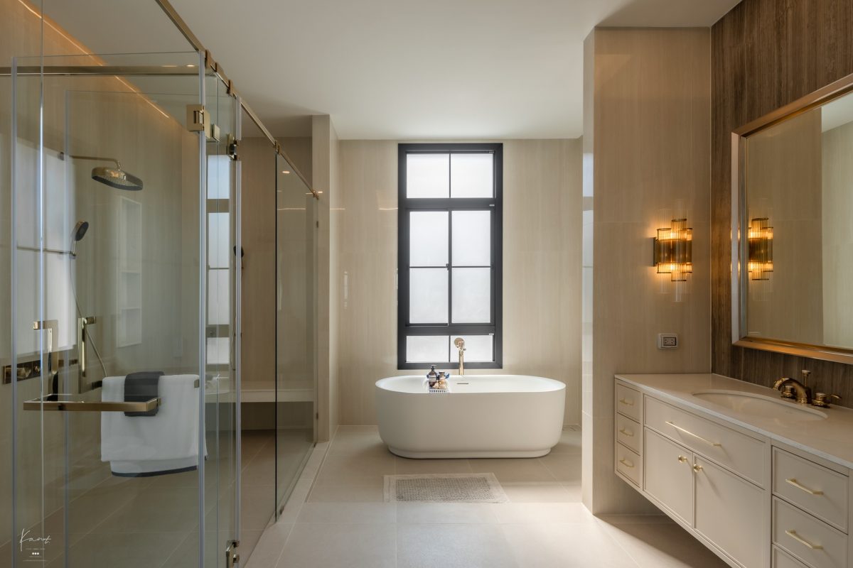 Walk-in Closet เชื่อมต่อกับ Master Bathroom ที่คุมโทนด้วยสีเบจและลายหินที่ดูสะอาดตา ตรงกลางจัดวางอ่างอาบน้ำแบบ Freestanding ไว้กึ่งกลางให้รับแสงธรรมชาติจากหน้าต่าง ฟังก์ชันด้านในจัดเต็มและแบ่งสัดส่วนชัดเจน ทั้งโซน Shower ที่กั้นกระจกใส และเคาน์เตอร์อ่างล้างหน้าแบบกว้าง ให้ความรู้สึกเหมือนเรากำลังใช้เวลาพักผ่อนอยู่ในสปาส่วนตัวของโรงแรมระดับ 5 ดาวครับ