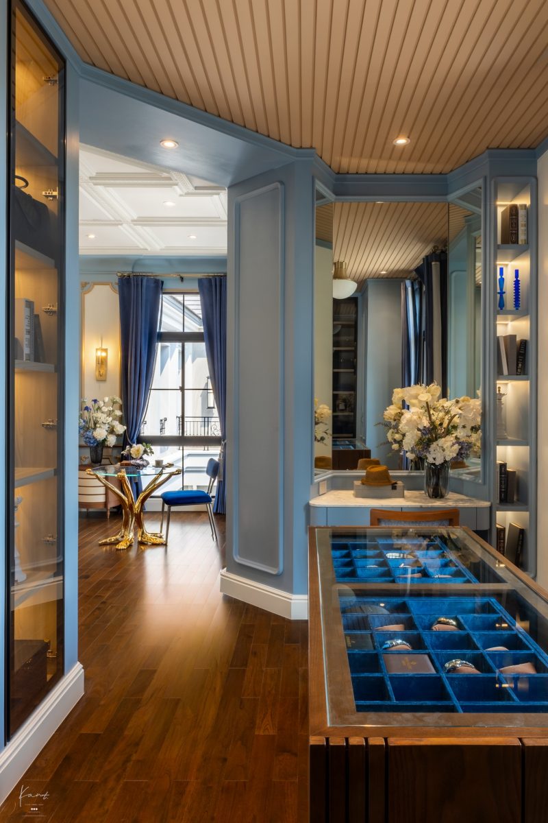 ด้านในเป็น Walk-in Closet จัดวาง Island ตรงกลางจัดเก็บเครื่องประดับที่บุกำมะหยี่สีน้ำเงินเข้มด้านใน มันให้ความรู้สึกเหมือนเรากำลังเดินเลือกไอเทมชิ้นโปรดอยู่ในบูทีคช้อปแบรนด์เนมเลยล่ะครับ