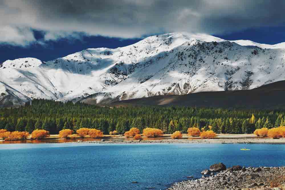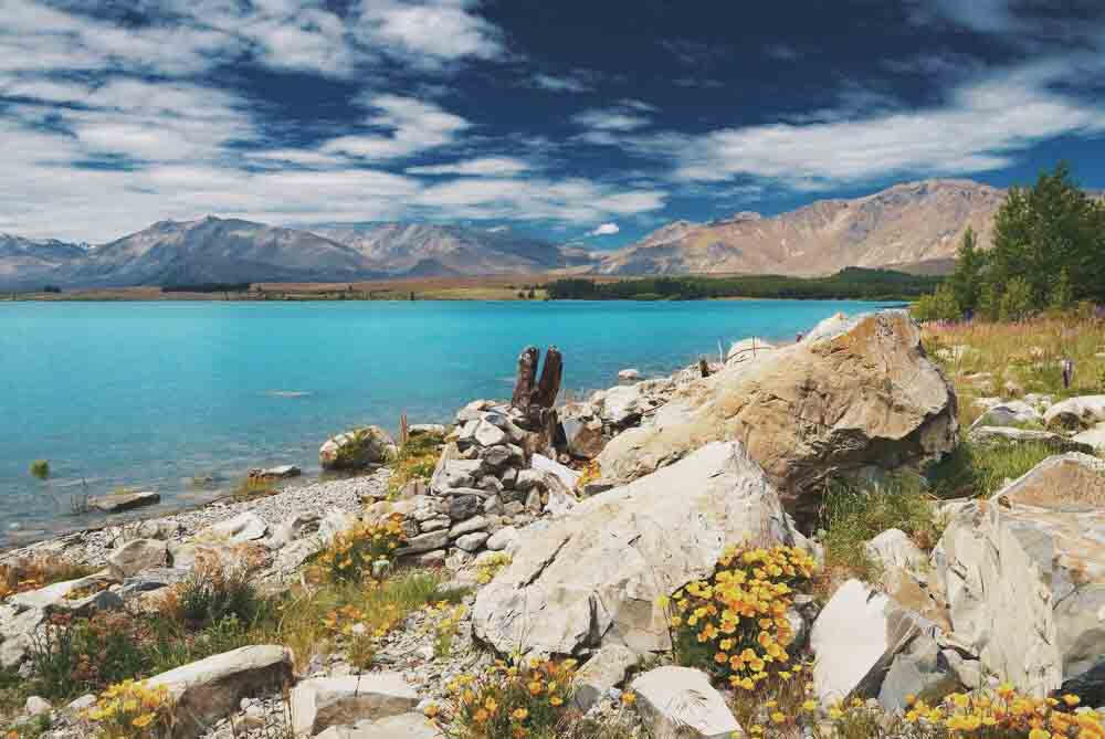 ทัศนียภาพของทะเลสาบน้ำจืดสีฟ้าเทอร์ควอยซ์ที่ล้อมรอบด้วยเทือกเขาสูง และทุ่งดอกไม้สีสันสดใส ที่ถูกจัดให้เป็น 1 ใน 10 สถานที่ท่องเที่ยวห้ามพลาดของนิวซีแลนด์ กับทิวทัศน์ที่สวยงามราวกับเทพนิยายของทะเลสาบเทคาโป (Lake Tekapo) ที่ตั้งอยู่บริเวณเชิงเทือกเขา Southern Alps ที่ระดับความสูง 700 เมตรเหนือระดับน้ำทะเลแห่งนี้ ที่พร้อมจะสะกดทุกสายตาของนักท่องเที่ยวที่แวะเวียนมายังดินแดนสวรรค์บนดินแห่งนี้ กับน้ำใสแจ๋วในทะเลสาบ อากาศเย็นสบายตลอดทั้งปี และบรรยากาศที่เงียบสงบ