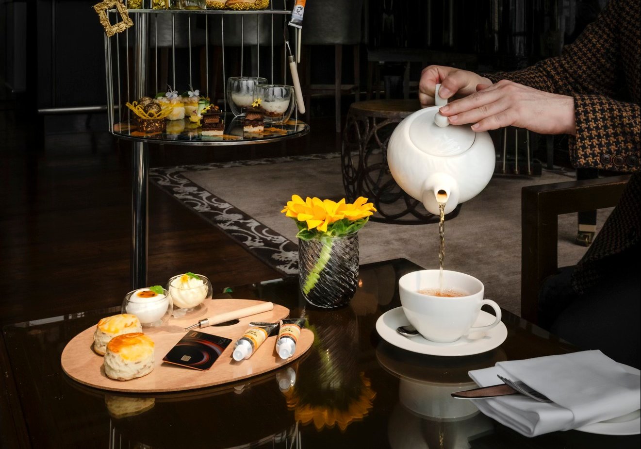 ส่วนที่เราชอบมากคือ สโคน ซึ่งเชฟได้เพิ่มเนื้อสัมผัสในตอนอบด้วยเมล็ดทานตะวัน แบ่งครึ่งแล้วปาดแยมแอปริคอทและแยมส้มใส่ในหลอดสีดูครีเอทดีมาก ให้เราบีบใส่เกรียงเล็กได้ตามใจชอบ เสิร์ฟบนจานสีน้ำมันน่ารักสุดๆ เชฟยังใช้เทคนิคทั้งการพิมพ์ลาย การใช้สีที่ได้แรงบันดาลใจจากงานศิลปะมาสร้างชุดน้ำชานี้ ในเซ็ตจะมีทั้งอาหารคาวหวาน และเครื่องดื่มค็อกเทลและม็อกเทลให้ได้ชิมกัน เพิ่มจากเมนูราคาเริ่มต้น 260 บาท ++ ต่อแก้ว
